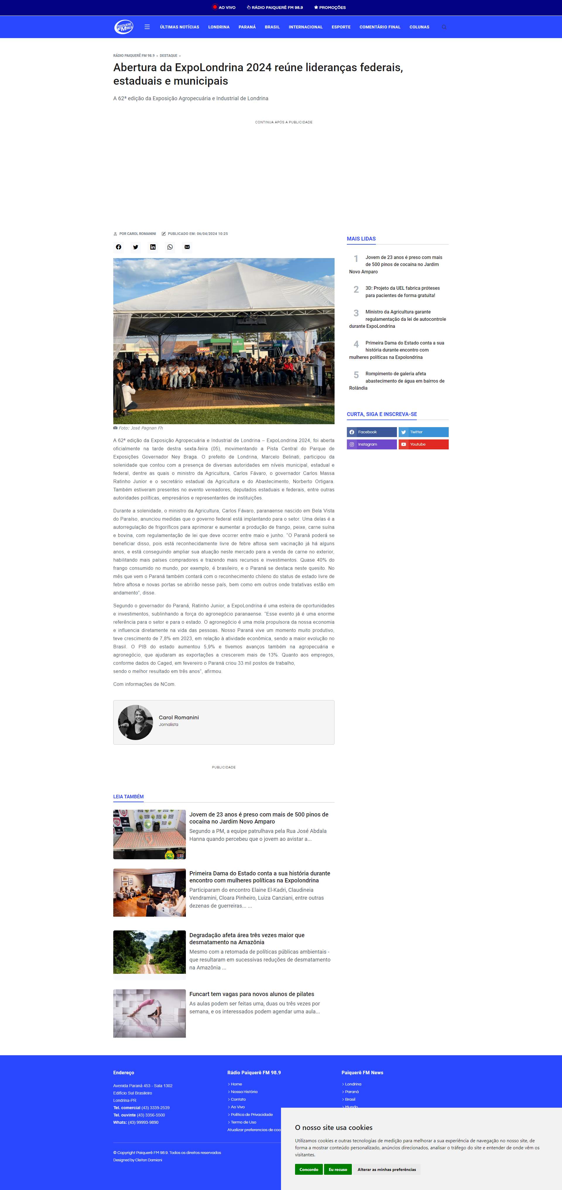 A 62ª edição da Exposição Agropecuária e Industrial de Londrina - ExpoLondrina 2024, foi aberta oficialmente na tarde destra sexta-feira (05), movimentando a Pista Central do Parque de Exposições Governador Ney Braga. O