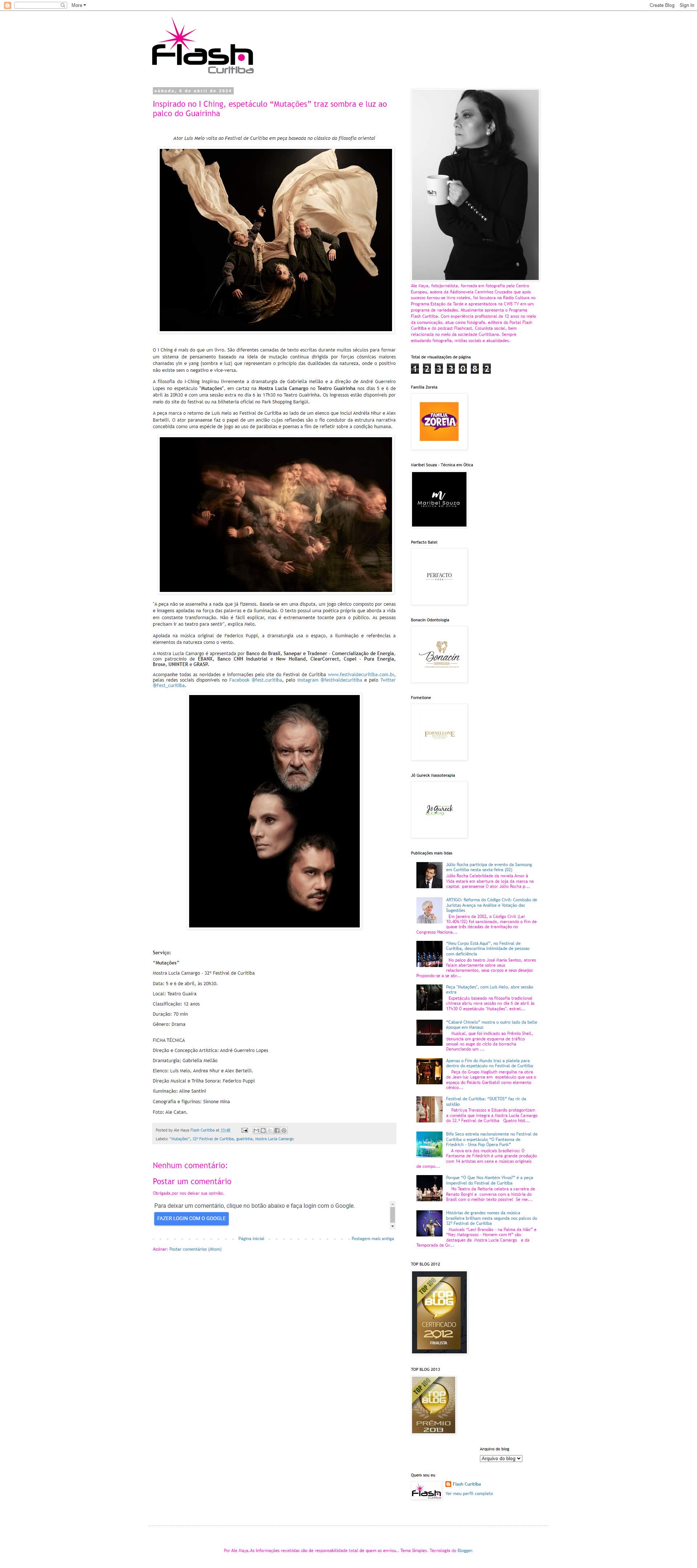 A filosofia do I-Ching inspirou livremente a dramaturgia de Gabriella Mellão e a direção de André Guerreiro Lopes no espetáculo "Mutações", em cartaz na Mostra Lucia Camargo no Teatro Guairinha nos dias 5 e 6 de abril às 20h30 e com uma sessão extra no dia 6 às 17h30 no Teatro Guairinha. Os ingressos estão disponíveis por meio do site do festival ou na bilheteria oficial no Park Shopping Barigüi.