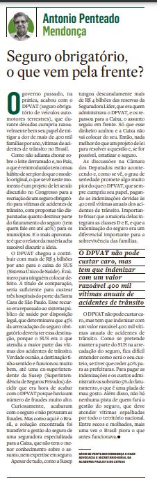 O governo passado, na prática, acabou com o DPVAT (seguro obrigatório de veículos automotores terrestres), que durante décadas cumpriu razoavelmente bem seu papel de mitigar a dor de mais de 400 mil famílias por ano, vítimas de acidentes de trânsito no Brasil. Como não adianta chorar sobre o leite derramado e, no País, o que é reintroduzido tem o mau hábito de ser pior do que o modelo original, o que se vê neste momento é um projeto de lei sendo discutido no Congresso para a recriação de um seguro obrigatório para vítimas de acidentes de trânsito, com propostas tão disparatadas quanto destinar parte do faturamento do seguro (tem quem fale em até 40%) para os municípios. E o mais apavorante é que o relator da matéria acha razoável discutir a ideia. O DPVAT chegou a contribuir com mais de R$ 3 bilhões por ano para o caixa do SUS (Sistema Único de Saúde). É número para ninguém colocar defeito. A título de comparação, seria suficiente para custear três hospitais do porte da Santa Casa de São Paulo. Esse recurso era repassado ao sistema público de saúde por disposição legal, que determinava que 45% da arrecadação do seguro obrigatório deveria ter essa destinação, porque o SUS era o que atendia a maior parte das vítimas dos acidentes de trânsito. Verdade ou não, a destinação tinha sentido e funcionou muito bem, até uma ex-superintendente da Susep (Superintendência de Seguros Privados) decidir que era hora de acabar com o DPVAT porque havia um número de fraudes muito alto. Curiosamente, acabaram com o seguro e não provaram as fraudes. Mas como aqui é o Brasil, a solução encontrada foi transferir a gestão do seguro de uma seguradora especializada para a Caixa, que não tem o menor conhecimento sobre o assunto, nem expertise em seguro. Apesar de tudo, como a Susep tungou descaradamente mais de R$ 4 bilhões das reservas da Seguradora Líder, que era quem administrava o DPVAT, e os repassou para a Caixa, o assunto seguiu em frente. Só que esse dinheiro acabou e a Caixa não vai colocar do seu. Então, nada melhor do que um projeto de lei para resolver a questão e, se for possível, estatizar o seguro. As discussões na Câmara dos Deputados estão acontecendo e, como se vê, o grau de seriedade promete algo muito pior do que o DPVAT, que sempre cumpriu seu papel, pagando as indenizações devidas às 400 mil vítimas anuais dos acidentes de trânsito. Importante frisar que a maioria delas integram as classes D e E, e que a indenização do seguro era um diferencial importante para a sobrevivência das famílias. O DPVAT não pode custar caro, mas tem que indenizar com um valor razoável 400 mil vítimas anuais de acidentes de trânsito. Como se pretende manter a parte do SUS na arrecadação do seguro, fica difícil entender como será o seu custeio, se tiver que ceder 40% para as prefeituras. Para pagar as indenizações e os custos administrativos sobrarão 5% do faturamento, o que é uma piada de mau gosto. Além disso, não há nenhuma pista de quem fará a gestão do seguro, que deve atender vítimas espalhadas por todo o território nacional. Entre secos e molhados, mais uma vez o Brasil piora o que antes funcionava.l