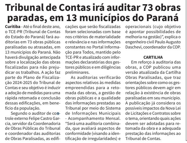 Curitiba - Até o final deste ano, o TCE-PR (Tribunal de Contas do Estado do Paraná) fará auditorias em 73 obras públicas paralisadas ou atrasadas, em 13 municípios do Paraná. Não haverá divulgação antecipada sobre a localização das obras fiscalizadas para não prejudicar os trabalhos. A ação faz parte do Plano de Fiscalização 2024-2025 do Tribunal de Contas e seu objetivo é induzir a adoção de medidas para uma rápida retomada e conclusão dessas edificações, em benefício da população. Segundo o auditor de controle externo Felipe Castro Garcia, servidor da Coordenadoria de Obras Públicas do Tribunal e coordenador das auditorias de Obras Paralisadas, as edificações que serão fiscalizadas foram selecionadas com base nos critérios de materialidade e relevância e nas informações constantes no Portal Informação para Todos, mantido pelo TCE-PR e atualizado com informações declaratórias dos gestores públicos e em diligências preliminares. As auditorias verificarão aspectos relativos às medidas empreendidas para a retomada das obras, a gestão de obras públicas e a qualidade das informações prestadas ao Tribunal por meio do Sistema de Informações Municipais - Acompanhamento Mensal. “Será uma auditoria combinada, que avaliará aspectos de conformidade (visando a identificação de irregularidades) e operacionais (cujo objetivo é apontar possibilidades de melhoria na gestão)”, explica o engenheiro civil Paulo Augusto Daschevi, coordenador da COP. CARTILHA Em reforço à auditoria das obras, a COP publicou uma versão atualizada da Cartilha Obras Paralisadas, que traz orientações sobre como os gestores públicos devem agir em relação à existência de obras paralisadas em seu município. A publicação já considera os possíveis impactos da Nova Lei de Licitações e Contratos sobre o tema, orientando quais ações devem ser adotadas para retomada da obra e a adequada prestação das informações ao Tribunal de Contas.