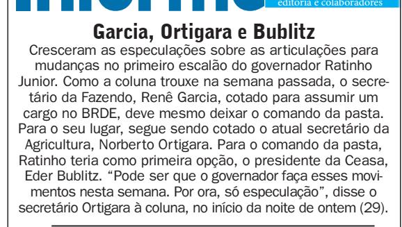 Cresceram as especulações sobre as articulações para mudanças no primeiro escalão do governador Ratinho Junior. Como a coluna trouxe na semana passada, o secretário da Fazendo, Renê Garcia, cotado para assumir um cargo no BRDE, deve mesmo deixar o comando da pasta. Para o seu lugar, segue sendo cotado o atual secretário da Agricultura, Norberto Ortigara. Para o comando da pasta, Ratinho teria como primeira opção, o presidente da Ceasa, Eder Bublitz. “Pode ser que o governador faça esses movimentos nesta semana. Por ora, só especulação”, disse o secretário Ortigara à coluna, no início da noite de ontem (29).