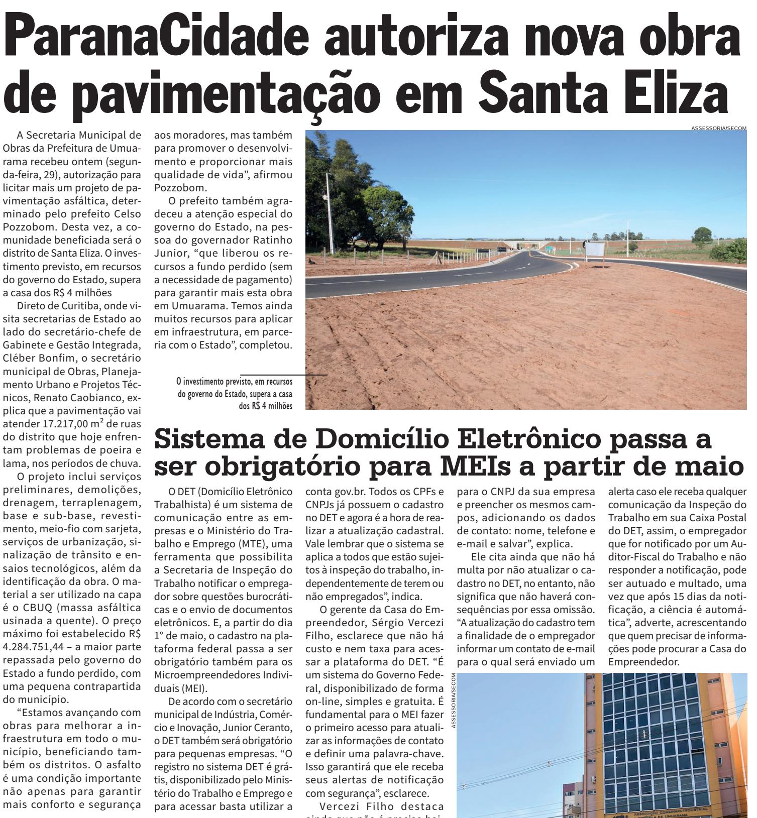 A Secretaria Municipal de Obras da Prefeitura de Umuarama recebeu ontem (segunda-feira, 29), autorização para licitar mais um projeto de pavimentação asfáltica, determinado pelo prefeito Celso Pozzobom. Desta vez, a comunidade beneficiada será o distrito de Santa Eliza. O investimento previsto, em recursos do governo do Estado, supera a casa dos R$ 4 milhões Direto de Curitiba, onde visita secretarias de Estado ao lado do secretário-chefe de Gabinete e Gestão Integrada, Cléber Bonfim, o secretário municipal de Obras, Planejamento Urbano e Projetos Técnicos, Renato Caobianco, explica que a pavimentação vai atender 17.217,00 m² de ruas do distrito que hoje enfrentam problemas de poeira e lama, nos períodos de chuva. O projeto inclui serviços preliminares, demolições, drenagem, terraplenagem, base e sub-base, revestimento, meio-fio com sarjeta, serviços de urbanização, sinalização de trânsito e ensaios tecnológicos, além da identificação da obra. O material a ser utilizado na capa é o CBUQ (massa asfáltica usinada a quente). O preço máximo foi estabelecido R$ 4.284.751,44 – a maior parte repassada pelo governo do Estado a fundo perdido, com uma pequena contrapartida do município. “Estamos avançando com obras para melhorar a infraestrutura em todo o município, beneficiando também os distritos. O asfalto é uma condição importante não apenas para garantir mais conforto e segurançaaos moradores, mas também para promover o desenvolvimento e proporcionar mais qualidade de vida”, afirmou Pozzobom. O prefeito também agradeceu a atenção especial do governo do Estado, na pessoa do governador Ratinho Junior, “que liberou os recursos a fundo perdido (sem a necessidade de pagamento) para garantir mais esta obra em Umuarama. Temos ainda muitos recursos para aplicar em infraestrutura, em parceria com o Estado”, completou.