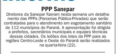 Diretores da Sanepar fizeram nesta semana um detalhamento das PPPs (Parcerias Público-Privadas) que serão contratadas para o atendimento em esgotamento sanitário de 112 municípios do Paraná. A apresentação foi dirigida a prefeitos, secretários municipais e equipes técnicas dessas cidades. Os leilões dos lotes da PPP para as regiões Centro-Leste e Oeste do Paraná serão realizados na quarta-feira (22).