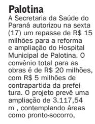 A Secretaria da Saúde do Paraná autorizou na sexta (17) um repasse de R$ 15 milhões para a reforma e ampliação do Hospital Municipal de Palotina. O convênio total para as obras é de R$ 20 milhões, com R$ 5 milhões de contrapartida da prefeitura. O projeto prevê uma ampliação de 3.117,54 m², contemplando áreas como pronto-socorro, ambulatório, enfermaria e estruturas de apoio.