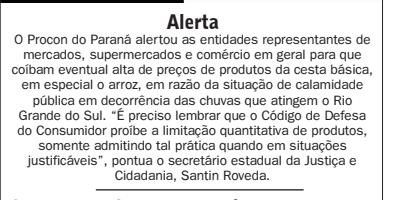 O Procon do Paraná alertou as entidades representantes de mercados, supermercados e comércio em geral para que coíbam eventual alta de preços de produtos da cesta básica, em especial o arroz, em razão da situação de calamidade pública em decorrência das chuvas que atingem o Rio Grande do Sul. “É preciso lembrar que o Código de Defesa do Consumidor proíbe a limitação quantitativa de produtos, somente admitindo tal prática quando em situações justificáveis”, pontua o secretário estadual da Justiça e Cidadania, Santin Roveda.