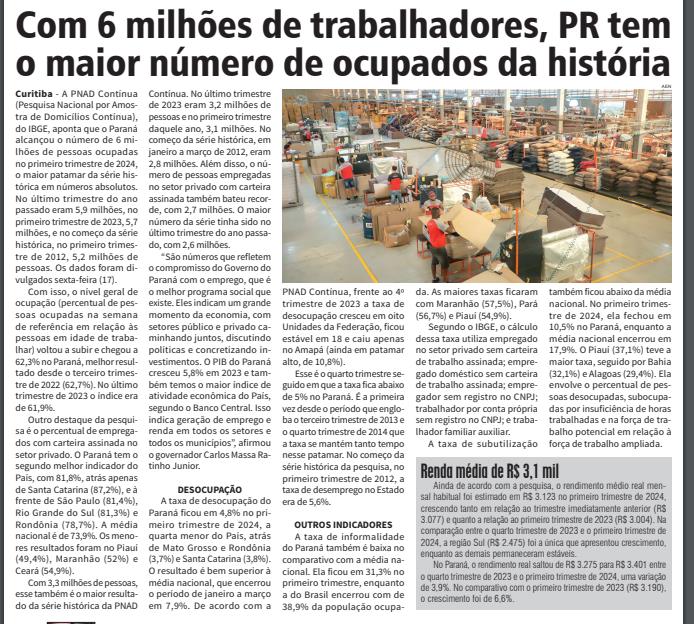 Curitiba - A PNAD Contínua (Pesquisa Nacional por Amostra de Domicílios Contínua), do IBGE, aponta que o Paraná alcançou o número de 6 milhões de pessoas ocupadas no primeiro trimestre de 2024, o maior patamar da série histórica em números absolutos. No último trimestre do ano passado eram 5,9 milhões, no primeiro trimestre de 2023, 5,7 milhões, e no começo da série histórica, no primeiro trimestre de 2012, 5,2 milhões de pessoas. Os dados foram divulgados sexta-feira (17). Com isso, o nível geral de ocupação (percentual de pessoas ocupadas na semana de referência em relação às pessoas em idade de trabalhar) voltou a subir e chegou a 62,3% no Paraná, melhor resultado desde o terceiro trimestre de 2022 (62,7%). No último trimestre de 2023 o índice era de 61,9%. Outro destaque da pesquisa é o percentual de empregados com carteira assinada no setor privado. O Paraná tem o segundo melhor indicador do País, com 81,8%, atrás apenas de Santa Catarina (87,2%), e à frente de São Paulo (81,4%), Rio Grande do Sul (81,3%) e Rondônia (78,7%). A média nacional é de 73,9%. Os menores resultados foram no Piauí (49,4%), Maranhão (52%) e Ceará (54,9%). Com 3,3 milhões de pessoas, esse também é o maior resultado da série histórica da PNAD Contínua. No último trimestre de 2023 eram 3,2 milhões de pessoas e no primeiro trimestre daquele ano, 3,1 milhões. No começo da série histórica, em janeiro a março de 2012, eram 2,8 milhões. Além disso, o número de pessoas empregadas no setor privado com carteira assinada também bateu recorde, com 2,7 milhões. O maior número da série tinha sido no último trimestre do ano passado, com 2,6 milhões. “São números que refletem o compromisso do Governo do Paraná com o emprego, que é o melhor programa social que existe. Eles indicam um grande momento da economia, com setores público e privado caminhando juntos, discutindo políticas e concretizando investimentos. O PIB do Paraná cresceu 5,8% em 2023 e também temos o maior índice de atividade econômica do País, segundo o Banco Central. Isso indica geração de emprego e renda em todos os setores e todos os municípios”, afirmou o governador Carlos Massa Ratinho Junior. DESOCUPAÇÃO A taxa de desocupação do Paraná ficou em 4,8% no primeiro trimestre de 2024, a quarta menor do País, atrás de Mato Grosso e Rondônia (3,7%) e Santa Catarina (3,8%). O resultado é bem superior à média nacional, que encerrou o período de janeiro a março em 7,9%. De acordo com a PNAD Contínua, frente ao 4º trimestre de 2023 a taxa de desocupação cresceu em oito Unidades da Federação, ficou estável em 18 e caiu apenas no Amapá (ainda em patamar alto, de 10,8%). Esse é o quarto trimestre seguido em que a taxa fica abaixo de 5% no Paraná. É a primeira vez desde o período que engloba o terceiro trimestre de 2013 e o quarto trimestre de 2014 que a taxa se mantém tanto tempo nesse patamar. No começo da série histórica da pesquisa, no primeiro trimestre de 2012, a taxa de desemprego no Estado era de 5,6%. OUTROS INDICADORES A taxa de informalidade do Paraná também é baixa no comparativo com a média nacional. Ela ficou em 31,3% no primeiro trimestre, enquanto a do Brasil encerrou com de 38,9% da população ocupada. As maiores taxas ficaram com Maranhão (57,5%), Pará (56,7%) e Piauí (54,9%). Segundo o IBGE, o cálculo dessa taxa utiliza empregado no setor privado sem carteira de trabalho assinada; empregado doméstico sem carteira de trabalho assinada; empregador sem registro no CNPJ; trabalhador por conta própria sem registro no CNPJ; e trabalhador familiar auxiliar. A taxa de subutilização também ficou abaixo da média nacional. No primeiro trimestre de 2024, ela fechou em 10,5% no Paraná, enquanto a média nacional encerrou em 17,9%. O Piauí (37,1%) teve a maior taxa, seguido por Bahia (32,1%) e Alagoas (29,4%). Ela envolve o percentual de pessoas desocupadas, subocupadas por insuficiência de horas trabalhadas e na força de trabalho potencial em relação à força de trabalho ampliada