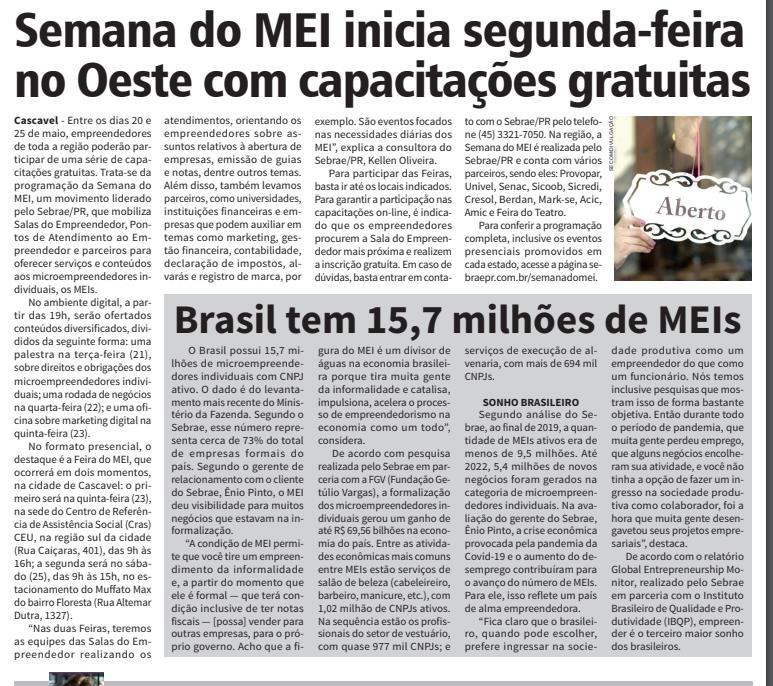 Cascavel - Entre os dias 20 e 25 de maio, empreendedores de toda a região poderão participar de uma série de capacitações gratuitas. Trata-se da programação da Semana do MEI, um movimento liderado pelo Sebrae/PR, que mobiliza Salas do Empreendedor, Pontos de Atendimento ao Empreendedor e parceiros para oferecer serviços e conteúdos aos microempreendedores individuais, os MEIs. No ambiente digital, a partir das 19h, serão ofertados conteúdos diversificados, divididos da seguinte forma: uma palestra na terça-feira (21), sobre direitos e obrigações dos microempreendedores individuais; uma rodada de negócios na quarta-feira (22); e uma oficina sobre marketing digital na quinta-feira (23). No formato presencial, o destaque é a Feira do MEI, que ocorrerá em dois momentos, na cidade de Cascavel: o primeiro será na quinta-feira (23), na sede do Centro de Referência de Assistência Social (Cras) CEU, na região sul da cidade (Rua Caiçaras, 401), das 9h às 16h; a segunda será no sábado (25), das 9h às 15h, no estacionamento do Muffato Max do bairro Floresta (Rua Altemar Dutra, 1327). “Nas duas Feiras, teremos as equipes das Salas do Empreendedor realizando os atendimentos, orientando os empreendedores sobre assuntos relativos à abertura de empresas, emissão de guias e notas, dentre outros temas. Além disso, também levamos parceiros, como universidades, instituições financeiras e empresas que podem auxiliar em temas como marketing, gestão financeira, contabilidade, declaração de impostos, alvarás e registro de marca, por exemplo. São eventos focados nas necessidades diárias dos MEI”, explica a consultora do Sebrae/PR, Kellen Oliveira. Para participar das Feiras, basta ir até os locais indicados. Para garantir a participação nas capacitações on-line, é indicado que os empreendedores procurem a Sala do Empreendedor mais próxima e realizem a inscrição gratuita. Em caso de dúvidas, basta entrar em contaEvite os aproveitadores JULIANO GAZOLA é fundador da Bioliderança® no Brasil, business executive coach, reprogramador biológico @jggazola Em nossa jornada pela vida, invariavelmente nos deparamos com pessoas de diversas índoles, algumas genuínas, outras nem tanto. Em um mundo cada vez mais conectado, é imperativo aprender a identificar e proteger-se dos zombadores e aproveitadores que podem cruzar nosso caminho virtual. Nesta coluna, exploraremos a importância de discernir, avaliar e tomar decisões informadas ao lidar com estranhos que oferecem cursos, terapias e oportunidades tentadoras na internet. Os julgamentos que fazemos ao longo da vida não são apenas uma expressão de nosso senso crítico, mas também um mecanismo de defesa contra possíveis enganos. Ter um coração puro, livre de julgamentos, é valioso, mas não podemos permitir que nossa bondade seja explorada. Afinal, evitar os zombadores e aproveitadores é mais sério do que podemos imaginar. Reconhecer nossa responsabilidade pela própria integridade é crucial. Inúmeras artimanhas são utilizadas por aproveitadores para tornar as pessoas vulneráveis, mas, no fundo, esses manipuladores não passam de palhaços disfarçados. Muitos deles alegam possuir conhecimento raro, conquistado com empenho e sacrifício, mas esse conhecimento muitas vezes não aborda as complexidades da vida. Como em um conto, às vezes, nos deparamos com lobos na pele de cordeiros. Se não podemos enfrentá-los de frente, devemos nos proteger a qualquer custo. Mas como podemos fazer isso? Quando você se depara com um vendedor de cursos ou terapias online, é essencial observar algumas coisas: A pessoa transmite segurança? Ela possui autoridade no assunto? Suas ações condizem com suas palavras? Tem um histórico de ajudar outras pessoas? A estética do que é oferecido é realista e moral? Os conselhos são razoáveis? Você percebe valores sólidos, morais e espirituais? Se alguém está vendendo algo na internet, verifique os depoimentos e a avaliação da plataforma. Lembre-se, uma avaliação completa deve ser feita, especialmente quando envolve educação e saúde. Como diz o ditado, “cuidado e canja de galinha nunca fizeram mal a ninguém”. Em um mundo repleto de oportunidades virtuais, a habilidade de discernimento é essencial. Tenha pessoas de confiança em quem possa confiar, sem ser paranoico, mas também sem ser ingênuo. Se algo não parece certo, leve isso em consideração. Com precaução e discernimento, podemos evitar os zombadores e aproveitadores e navegar com mais segurança nas águas turbulentas das relações online. to com o Sebrae/PR pelo telefone (45) 3321-7050. Na região, a Semana do MEI é realizada pelo Sebrae/PR e conta com vários parceiros, sendo eles: Provopar, Univel, Senac, Sicoob, Sicredi, Cresol, Berdan, Mark-se, Acic, Amic e Feira do Teatro. Para conferir a programação completa, inclusive os eventos presenciais promovidos em cada estado, acesse a página sebraepr.com.br/semanadomei.