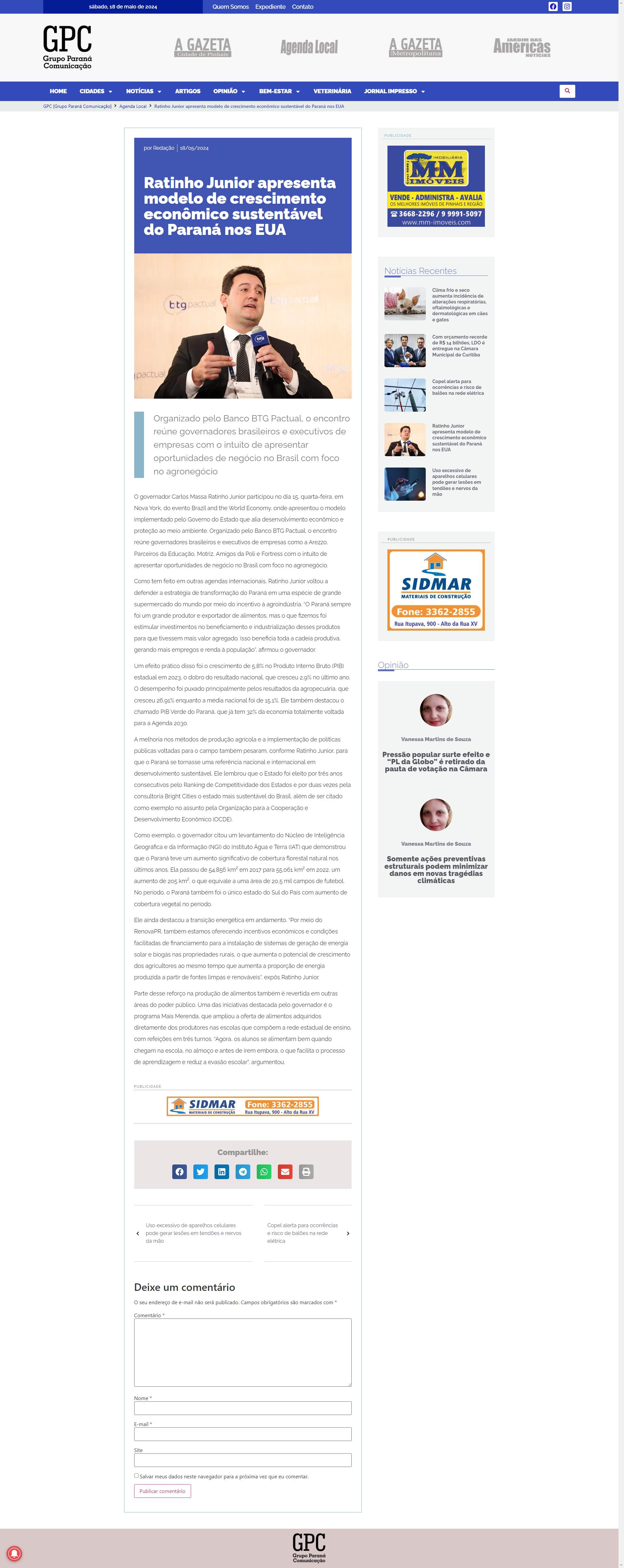 governador Carlos Massa Ratinho Junior participou no dia 15, quarta-feira, em Nova York, do evento Brazil and the World Economy, onde apresentou o modelo implementado pelo
