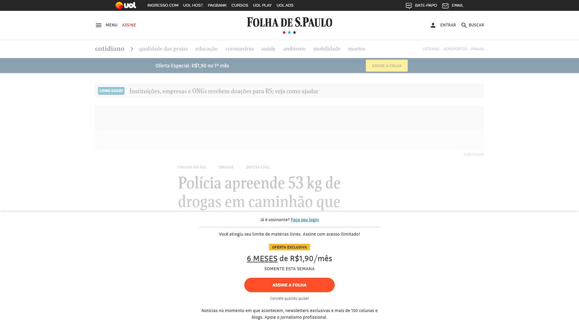 Um caminhão que levava doações ao Rio Grande do Sul, que vive tragédia causada pelas chuvas, foi apreendido com 53 quilos de drogas na rodovia estadual SC-480, na altura do município de São Domingos (SC), no oeste catarinense.