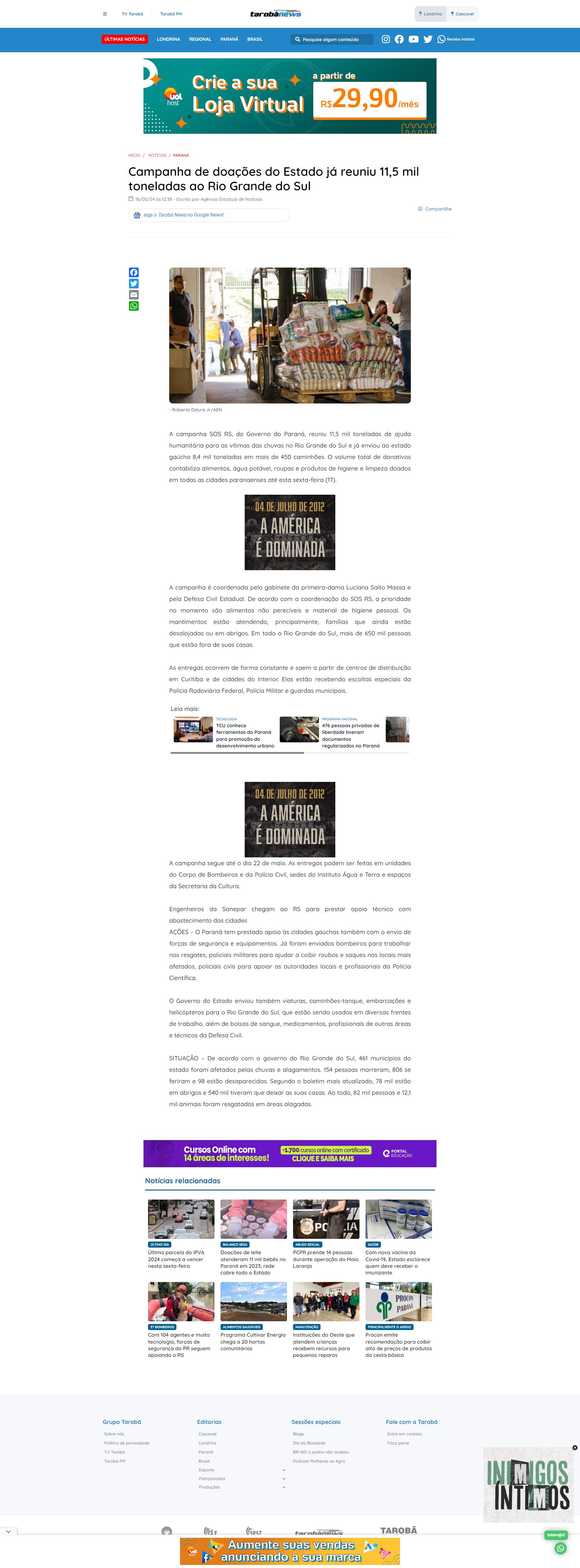 Governo do Paraná, reuniu 11,5 mil toneladas de ajuda humanitária para as vítimas das chuvas no Rio Grande do Sul e já enviou ao estado gaúcho 8,4 mil toneladas em mais de 450 caminhões. O volume total de donativos contabiliza alimentos, água potável, roupas e produtos de higiene e limpeza doados em todas as cidades paranaenses até esta sexta-feira (17).