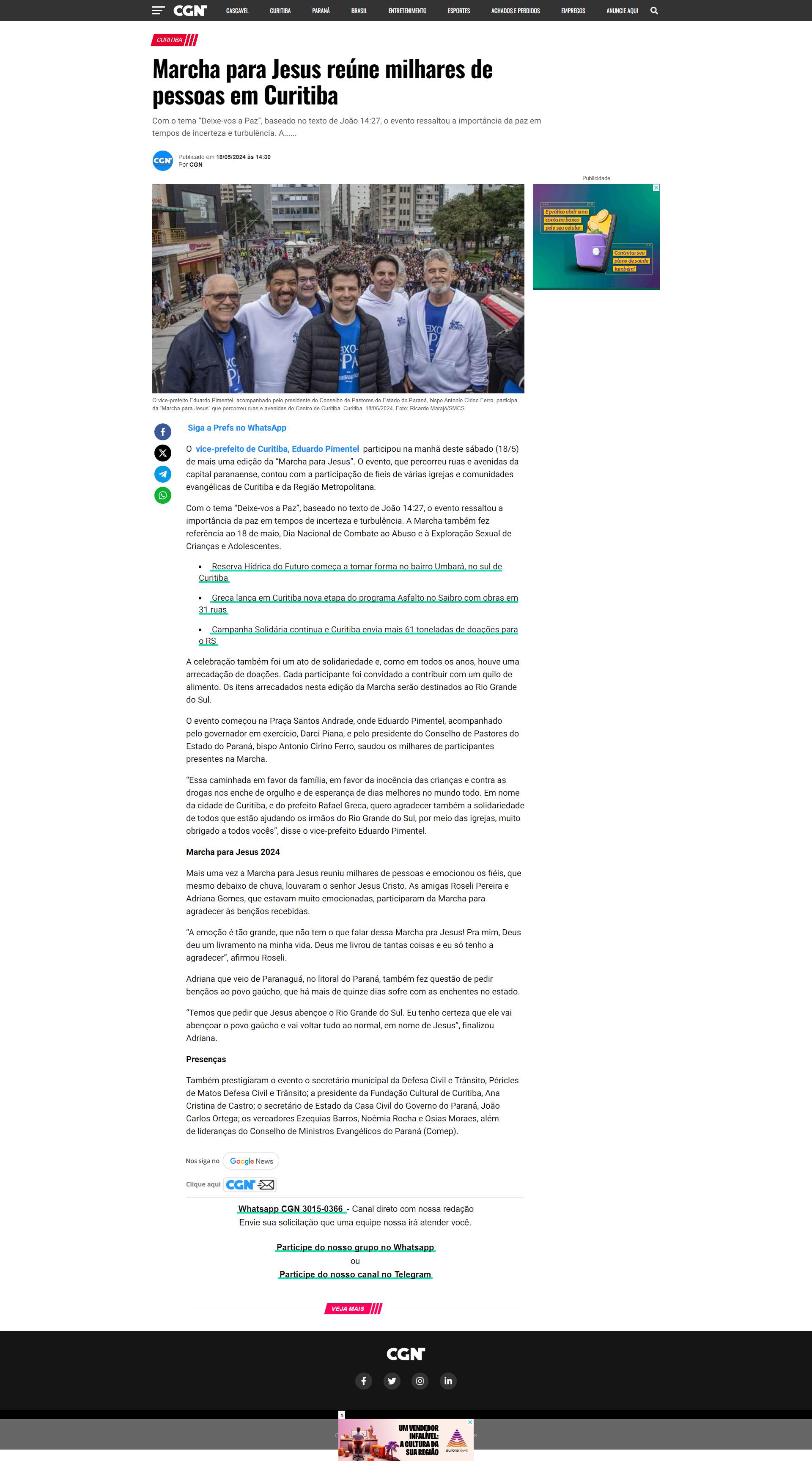 O vice-prefeito de Curitiba, Eduardo Pimentel participou na manhã deste sábado (18/5) de mais uma edição da “Marcha para Jesus”. O evento, que percorreu ruas e avenidas da capital paranaense, contou com a participação de fieis de várias igrejas e comunidades evangélicas de Curitiba e da Região Metropolitana.