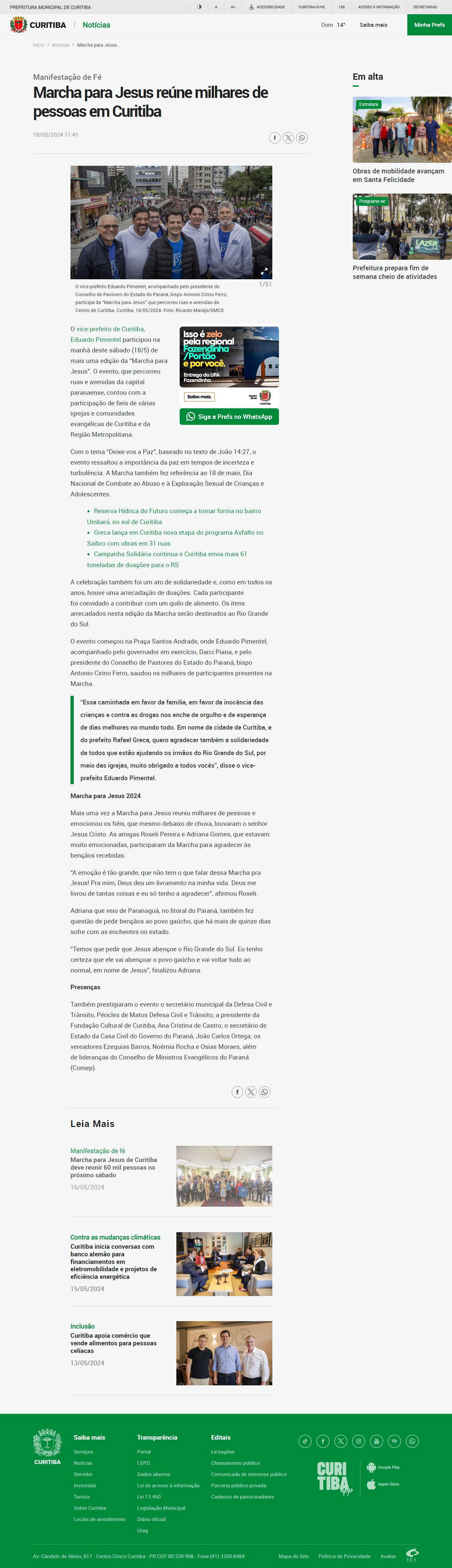 O vice-prefeito de Curitiba, Eduardo Pimentel participou na manhã deste sábado (18/5) de mais uma edição da “Marcha para Jesus”. O evento, que percorreu ruas e avenidas da capital paranaense, contou com a participação de fieis de várias igrejas e comunidades evangélicas de Curitiba e da Região Metropolitana.