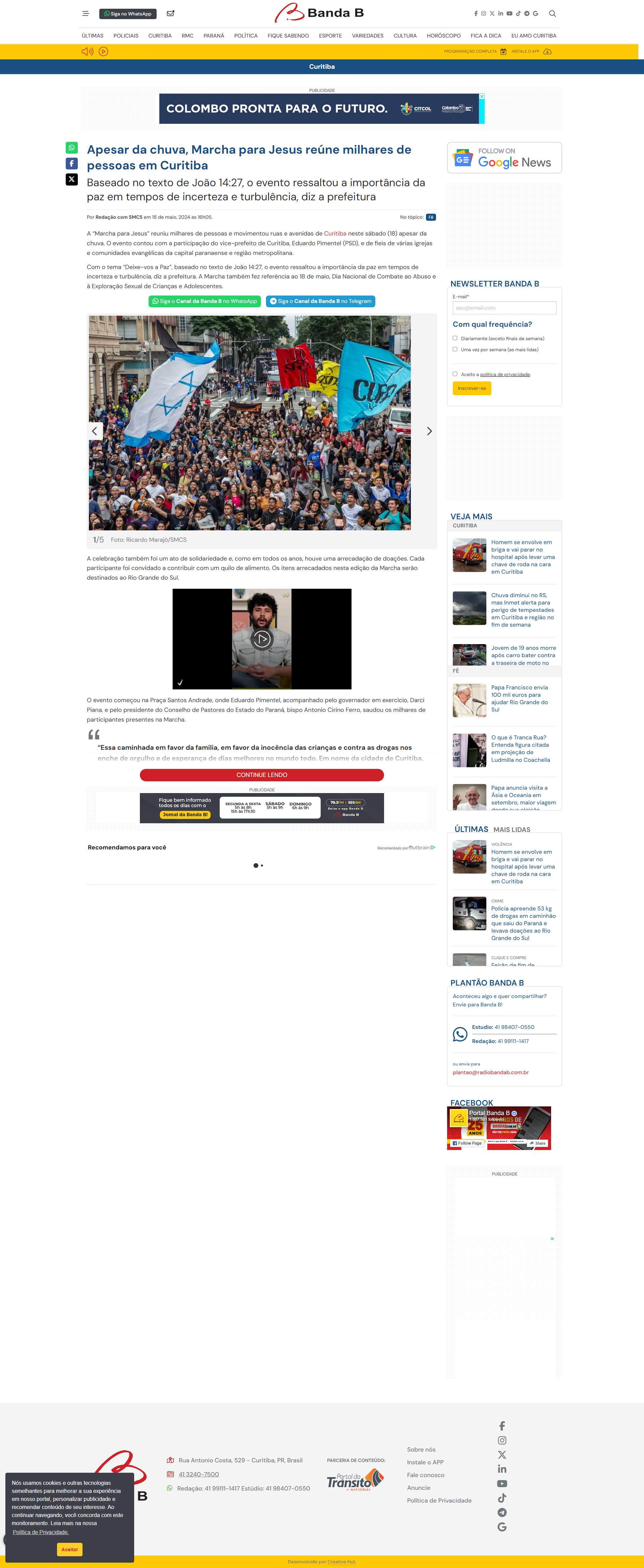 A “Marcha para Jesus” reuniu milhares de pessoas e movimentou ruas e avenidas de Curitiba neste sábado (18) apesar da chuva. O evento contou com a participação do vice-prefeito de Curitiba, Eduardo Pimentel (PSD), e de fieis de várias igrejas e comunidades evangélicas da capital paranaense e região metropolitana.