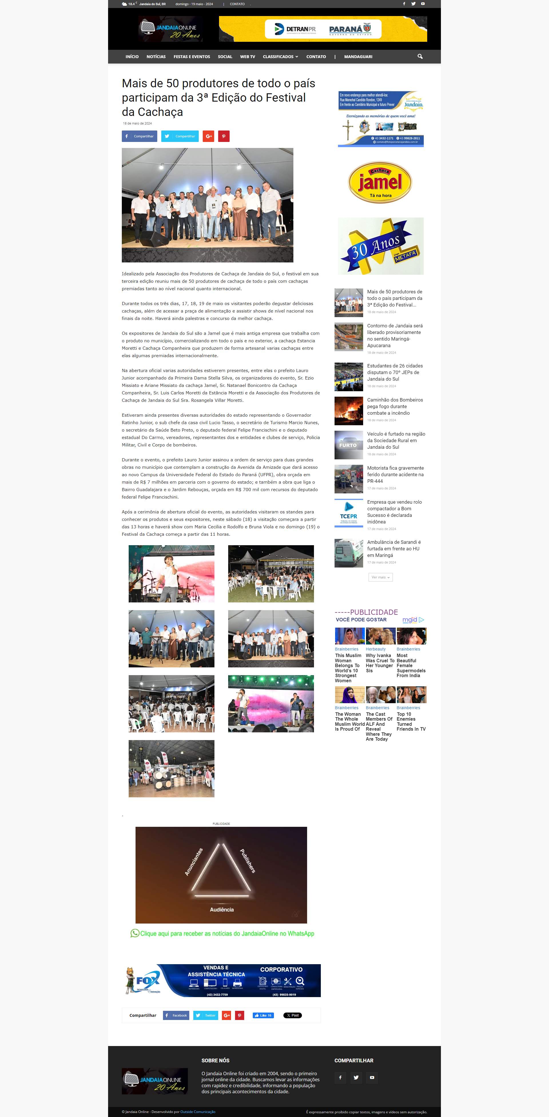 Após a cerimônia de abertura oficial do evento, as autoridades visitaram os standes para conhecer os produtos e seus expositores, neste sábado (18) a visitação começara a partir das 13 horas e haverá show com Maria Cecilia e Rodolfo e Bruna Viola e no domingo (19) o Festival da Cachaça começa a partir das 11 horas.