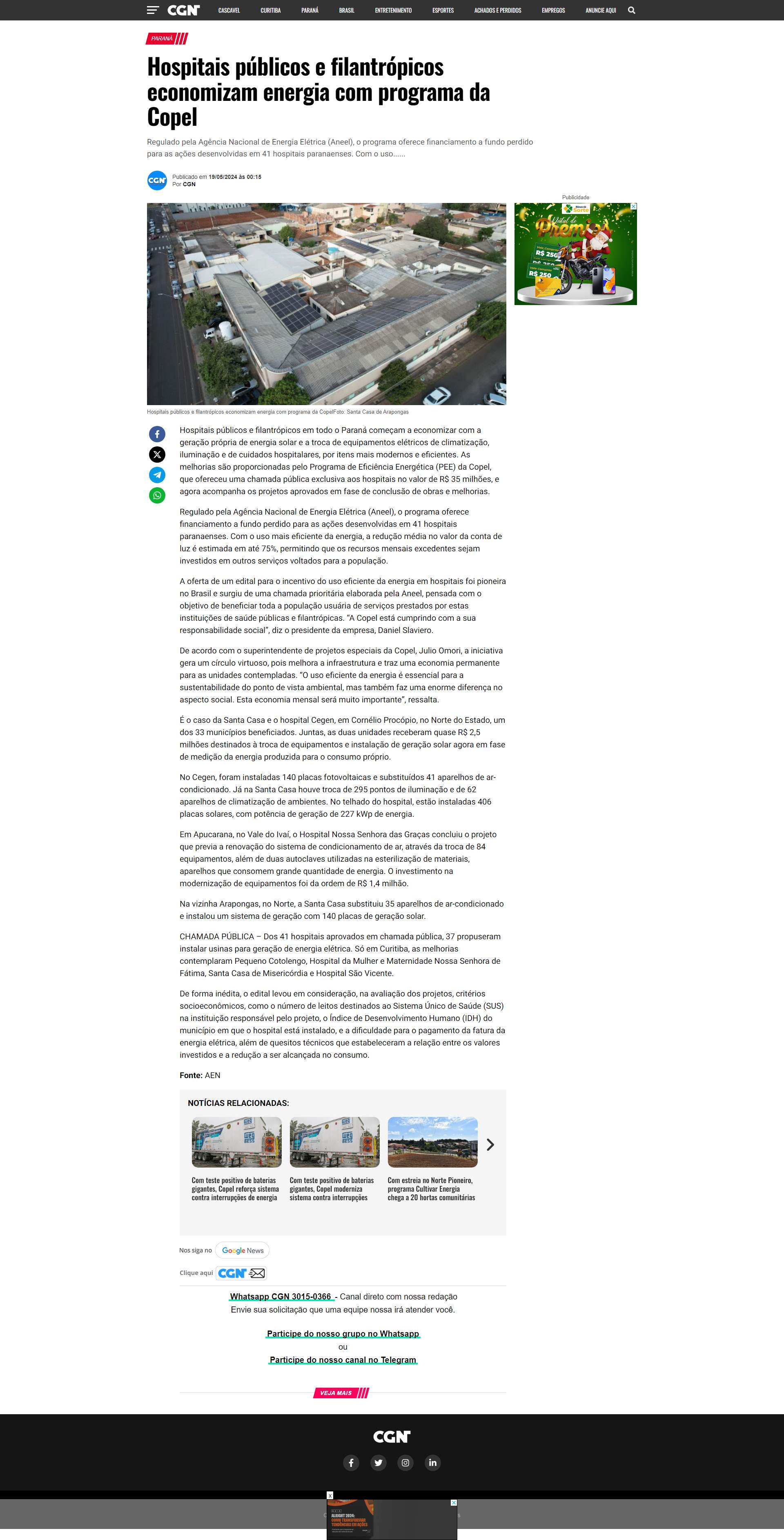 É o caso da Santa Casa e o hospital Cegen, em Cornélio Procópio, no Norte do Estado, um dos 33 municípios beneficiados. Juntas, as duas unidades receberam quase R$ 2,5 milhões destinados à troca de equipamentos e instalação de geração solar agora em fase de medição da energia produzida para o consumo próprio.