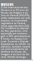 O Dia Internacional dos Museus e os 55 anos do Museu da Imagem e do Som do Paraná (MIS/PR), serão celebrados em dois eventos na Assembleia Legislativa do Paraná, nesta segunda-feira (20). Por iniciativa do deputado Ney Leprevost, uma exposição em homenagem o MIS será aberta às 9 horas, no Espaço Cultural. Durante o Grande Expediente, às 14h30, no plenário, também haverá um pronunciamento da diretora do Museu da Imagem e do Som do Paraná, Mirele Camargo.