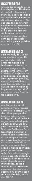 Pela manhã, às 10h30, uma audiência pública vai tratar sobre o enfrentamento aos fenômenos climáticos e a prevenção de desastres ambientais em Curitiba. O objetivo do proponente, deputado Ney Leprevost (União), é ouvir especialistas para buscar alternativas que possam mitigar os impactos na capital. O evento será no Auditó- rio Legislativo.