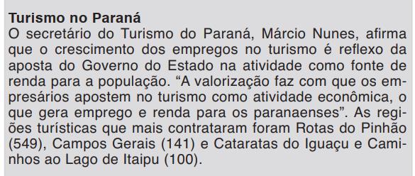 O secretário do Turismo do Paraná, Márcio Nunes, afirma que o crescimento dos empregos no turismo é reflexo da aposta do Governo do Estado na atividade como fonte de renda para a população. “A valorização faz com que os empresários apostem no turismo como atividade econômica, o que gera emprego e renda para os paranaenses”. As regiões turísticas que mais contrataram foram Rotas do Pinhão (549), Campos Gerais (141) e Cataratas do Iguaçu e Caminhos ao Lago de Itaipu (100).