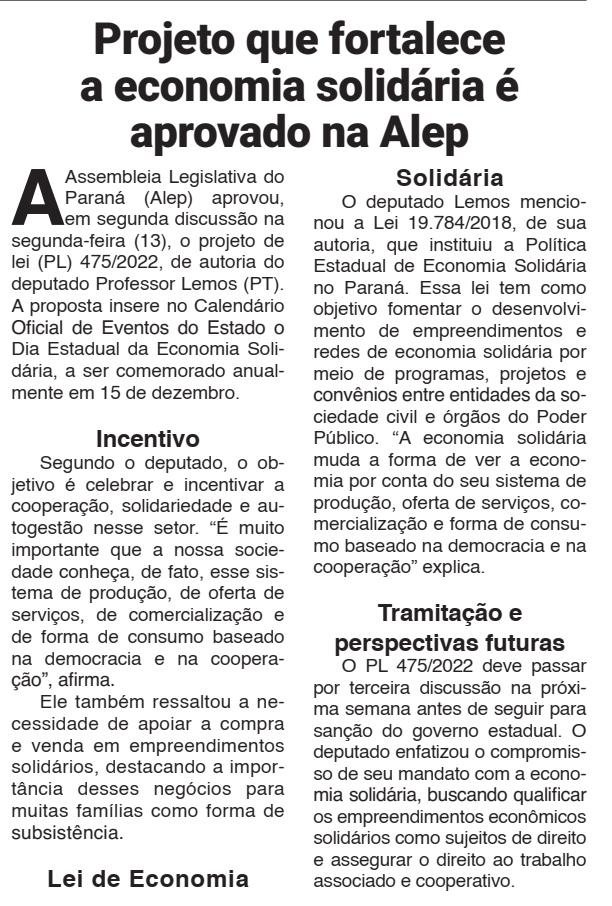 AAssembleia Legislativa do Paraná (Alep) aprovou, em segunda discussão na segunda-feira (13), o projeto de lei (PL) 475/2022, de autoria do deputado Professor Lemos (PT). A proposta insere no Calendário Oficial de Eventos do Estado o Dia Estadual da Economia Solidária, a ser comemorado anualmente em 15 de dezembro. Incentivo Segundo o deputado, o objetivo é celebrar e incentivar a cooperação, solidariedade e autogestão nesse setor. “É muito importante que a nossa sociedade conheça, de fato, esse sistema de produção, de oferta de serviços, de comercialização e de forma de consumo baseado na democracia e na coopera- ção”, afirma. Ele também ressaltou a necessidade de apoiar a compra e venda em empreendimentos solidários, destacando a importância desses negócios para muitas famílias como forma de subsistência. Lei de Economia Solidária O deputado Lemos mencionou a Lei 19.784/2018, de sua autoria, que instituiu a Política Estadual de Economia Solidária no Paraná. Essa lei tem como objetivo fomentar o desenvolvimento de empreendimentos e redes de economia solidária por meio de programas, projetos e convênios entre entidades da sociedade civil e órgãos do Poder Público. “A economia solidária muda a forma de ver a economia por conta do seu sistema de produção, oferta de serviços, comercialização e forma de consumo baseado na democracia e na cooperação” explica. Tramitação e perspectivas futuras O PL 475/2022 deve passar por terceira discussão na próxima semana antes de seguir para sanção do governo estadual. O deputado enfatizou o compromisso de seu mandato com a economia solidária, buscando qualificar os empreendimentos econômicos solidários como sujeitos de direito e assegurar o direito ao trabalho associado e cooperativo.