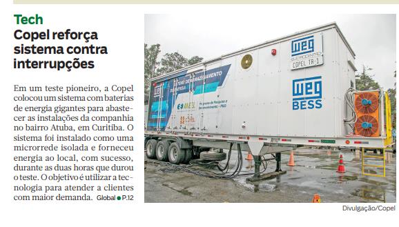 Em um teste pioneiro, a Copel colocou um sistema com baterias de energia gigantes para abastecer as instalações da companhia no bairro Atuba, em Curitiba. O sistema foi instalado como uma microrrede isolada e forneceu energia ao local, com sucesso, durante as duas horas que durou o teste. O objetivo é utilizar a tecnologia para atender a clientes com maior demanda. Global l P.12