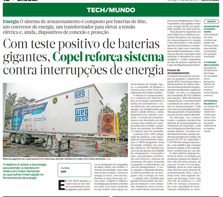 EM UM TESTE pioneiro, a Copel colocou um sistema com baterias de energia gigantes para abastecer as instalações da companhia no bairro Atuba, em Curitiba. O sistema foi instalado como uma microrrede isolada e forneceu energia ao local, com sucesso, durante as duas horas que durou o teste. O objetivo é utilizar a tecnologia para atender a clientes em redes com maior demanda E ou que sofram interrupção nofornecimento de energia. Agora, a companhia vai preparar a estrutura para testá-la em uma subestação da Grande Curitiba. O sistema de armazenamento é composto por baterias de lítio (tecnologia semelhante à usada em smartphones e carros elétricos), um conversor de energia, um transformador para elevar a tensão elétrica e, ainda, dispositivos de conexão e proteção. A estação de armazenamento está instalada em duas carretas que podem ser transportadas para atender a população em qualquer localidade. O conjunto pesa 50 toneladas. A estação tem 1 MW (megawatt) de potência, com capacidade de armazenamento superior a 1 MWh (megawatt-hora) de energia. Sozinha, ela consegue abastecer 200 famílias por cerca de um dia sem necessidade de carregamento. Conectada à rede, sua principal contribuição será reforçar o sistema em momentos de maior demanda ou garantir o fornecimento em caso de desligamentos. À noite, quando a demanda diminui, as baterias podem ser recarregadas com a energia da rede. A solução abre caminho para garantir fornecimento de energia em situações como temporais, batidas de carros em postes e outros fatores externos que provocam desligamentos. Para o consumidor, isso signifi ca contar com energia elétrica de qualidade quando ele mais precisa. “Essa iniciativa representa um marco histórico e evidencia o potencial disruptivo dos sistemas de armazenamento de energia e das microrredes. É um avanço que não só demonstra o compromisso da Copel com a inovação, mas também impulsiona o caminho em direção a um futuro mais resiliente e sustentável no setor energético”, avalia o engenheiro da área de projetos especiais da Copel, Rodrigo Braun dos Santos. Futuro do Armazenamento A iniciativa faz parte de um projeto de pesquisa e desenvolvimento (P&D Aneel) para testar o funcionamento de quatro sistemas de armazenamento de grande porte em diferentes regiões do Estado. Ao todo, a companhia está investindo R$ 34,6 milhões nas soluções. Além das baterias transportáveis, o montante inclui a instalação de outros três sistemas de armazenamento. Cada um conta com uma aplicação distinta que permite à Copel analisar seu uso em um cenário diferente. Em Ipiranga, nos Campos Gerais, a empresa instalou dois sistemas de armazenamento na subestação do município. Cada um é formado por baterias de um modelo distinto. Um deles contém baterias de lítio, mesmo modelo das testadas em Curitiba. Ele possui 250 kW de capacidade e 1.505 kWh de energia armazenada, o que signifi ca que consegue fornecer energia a 240 consumidores residenciais por um dia. O outro sistema emprega baterias de fluxo, tecnologia que armazena energia em líquido e têm vida útil mais extensa, de cerca de 20 anos. Por sua durabilidade, pode ser uma solução mais eficiente para estações de armazenamento fixas, como a desse teste. Este segundo sistema em Ipiranga conta com 250 kW de potência e 1.200 kWh de energia armazenada e tem capacidade de fornecimento semelhante ao outro.