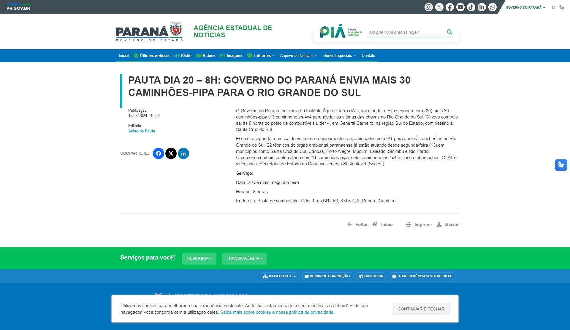 Instituto Água e Terra (IAT), vai mandar nesta segunda-feira (20) mais 30 caminhões-pipa e 3 caminhonetes 4x4 para ajudar as vítimas das chuvas no Rio Grande do Sul. O novo comboio sai às 8 horas do posto de combustíveis Líder 4, em General Carneiro, na região Sul do Estado, com destino à Santa Cruz do Sul.