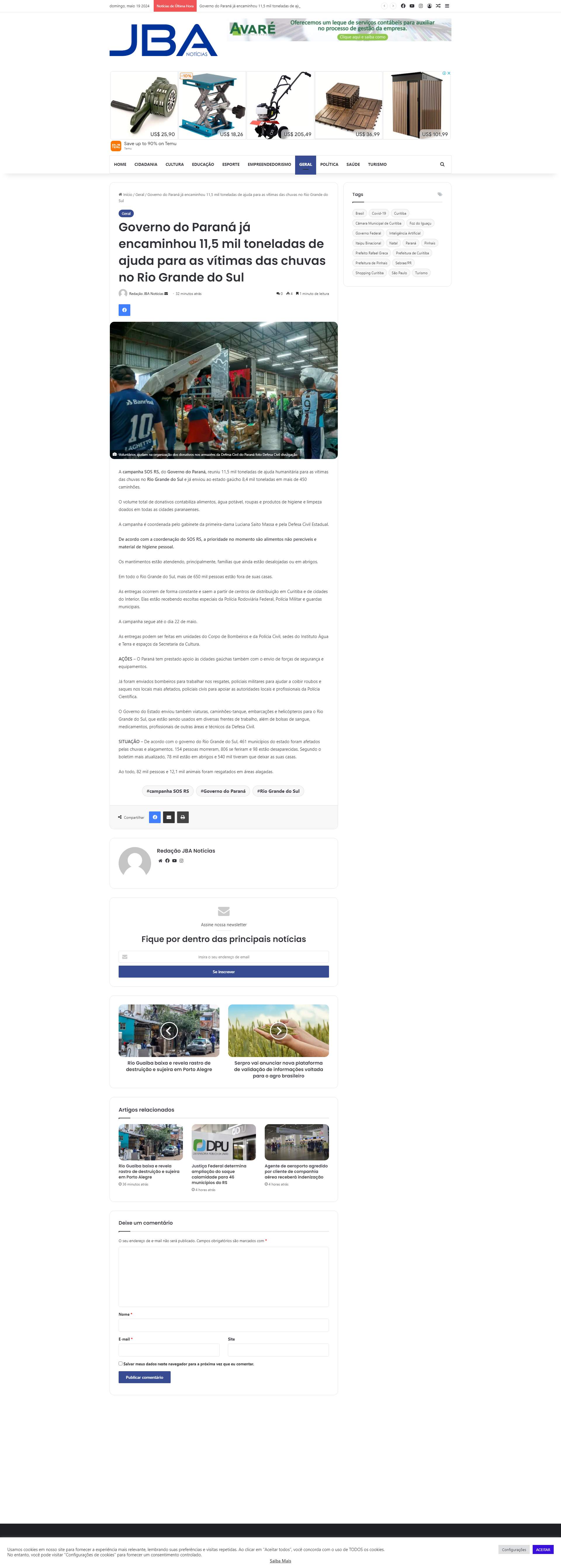 A campanha SOS RS, do Governo do Paraná, reuniu 11,5 mil toneladas de ajuda humanitária para as vítimas das chuvas no Rio Grande do Sul e já enviou ao estado gaúcho 8,4 mil toneladas em mais de 450 caminhões.