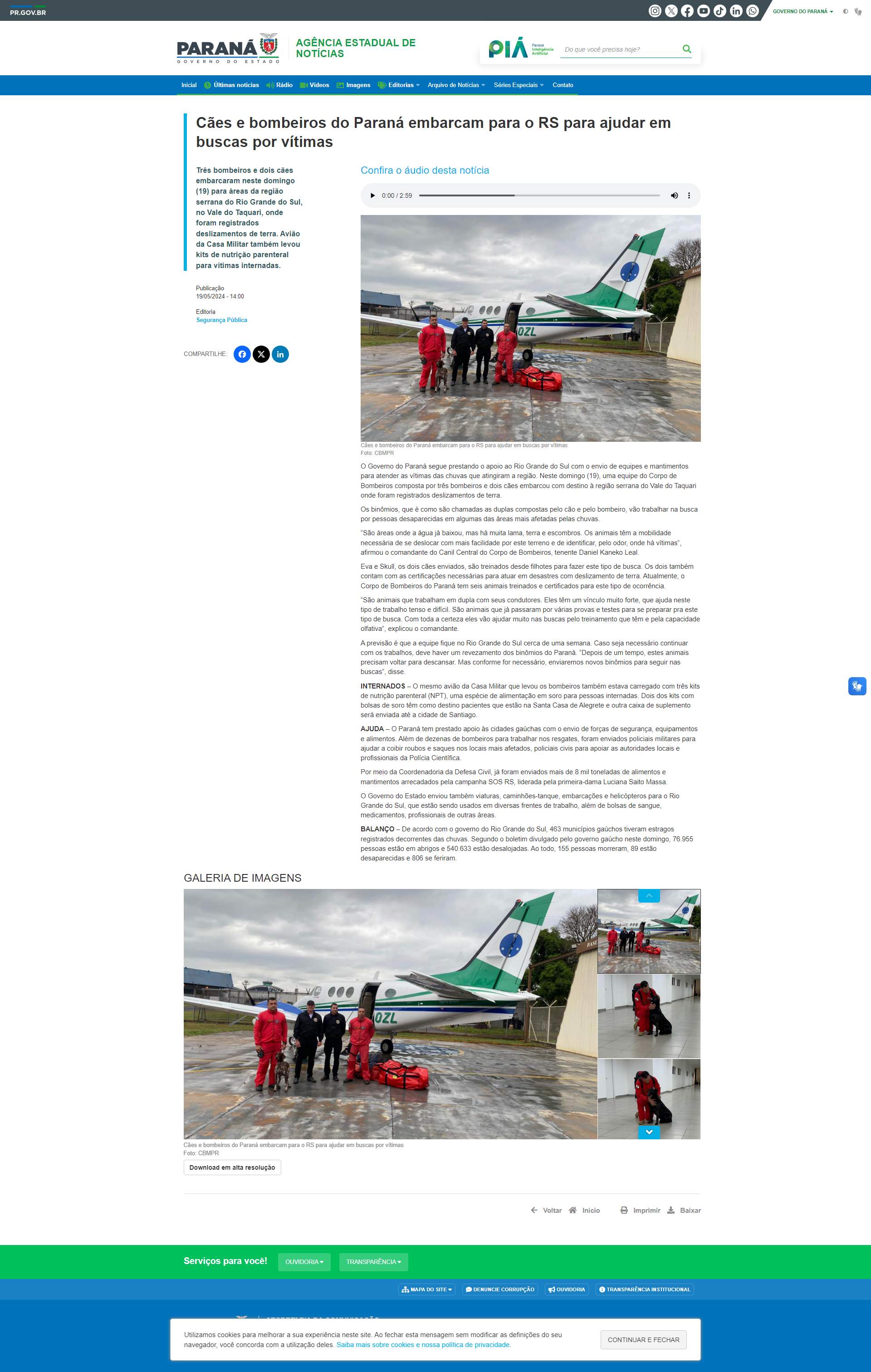 Paraná tem prestado apoio às cidades gaúchas com o envio de forças de segurança, equipamentos e alimentos. Além de dezenas de bombeiros para trabalhar nos resgates, foram enviados policiais militares para ajudar a coibir roubos e saques nos locais mais afetados, policiais civis para apoiar as autoridades locais e profissionais da Polícia Científica.
