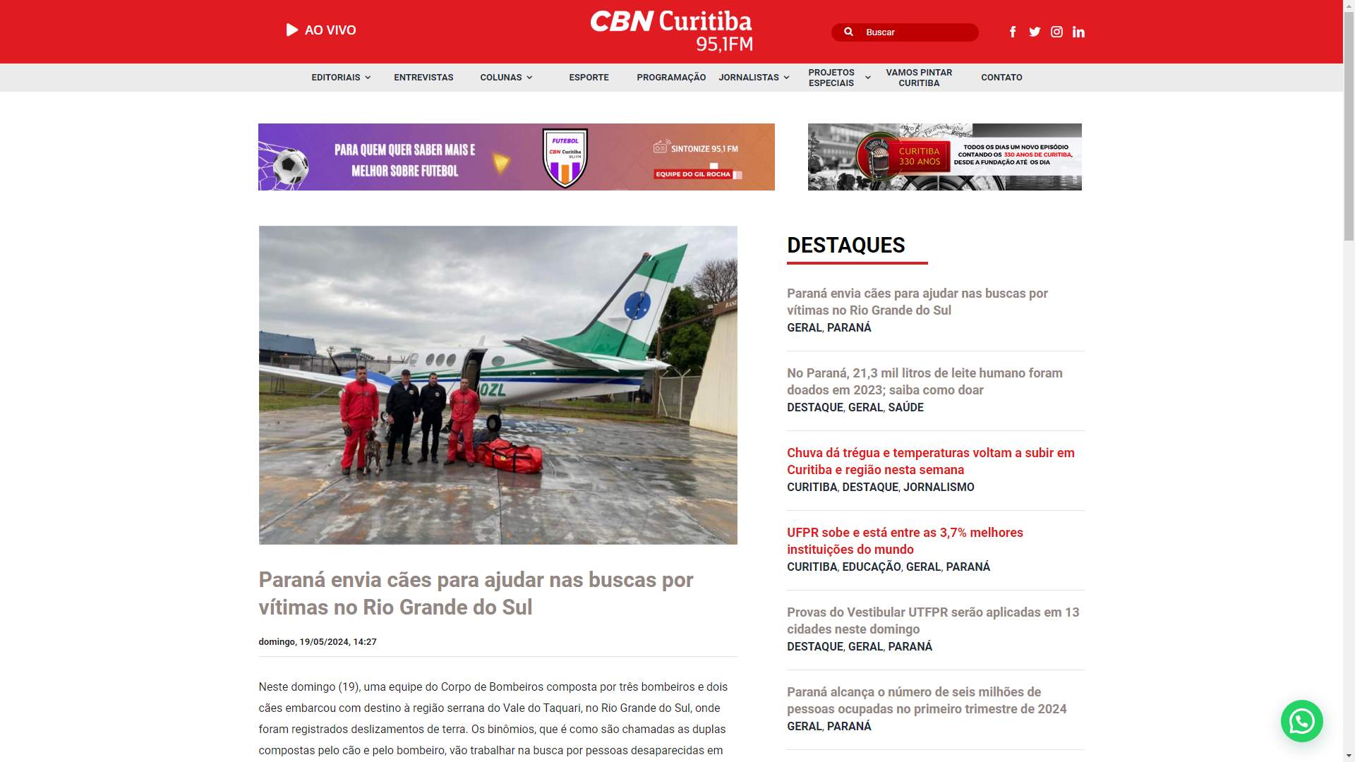 Corpo de Bombeiros composta por três bombeiros e dois cães embarcou com destino à região serrana do Vale do Taquari, no Rio Grande do Sul, onde foram registrados deslizamentos de terra. Os binômios, que é como são chamadas as duplas compostas pelo cão e pelo bombeiro, vão trabalhar na busca por pessoas desaparecidas em algumas das áreas mais afetadas pelas chuvas.
