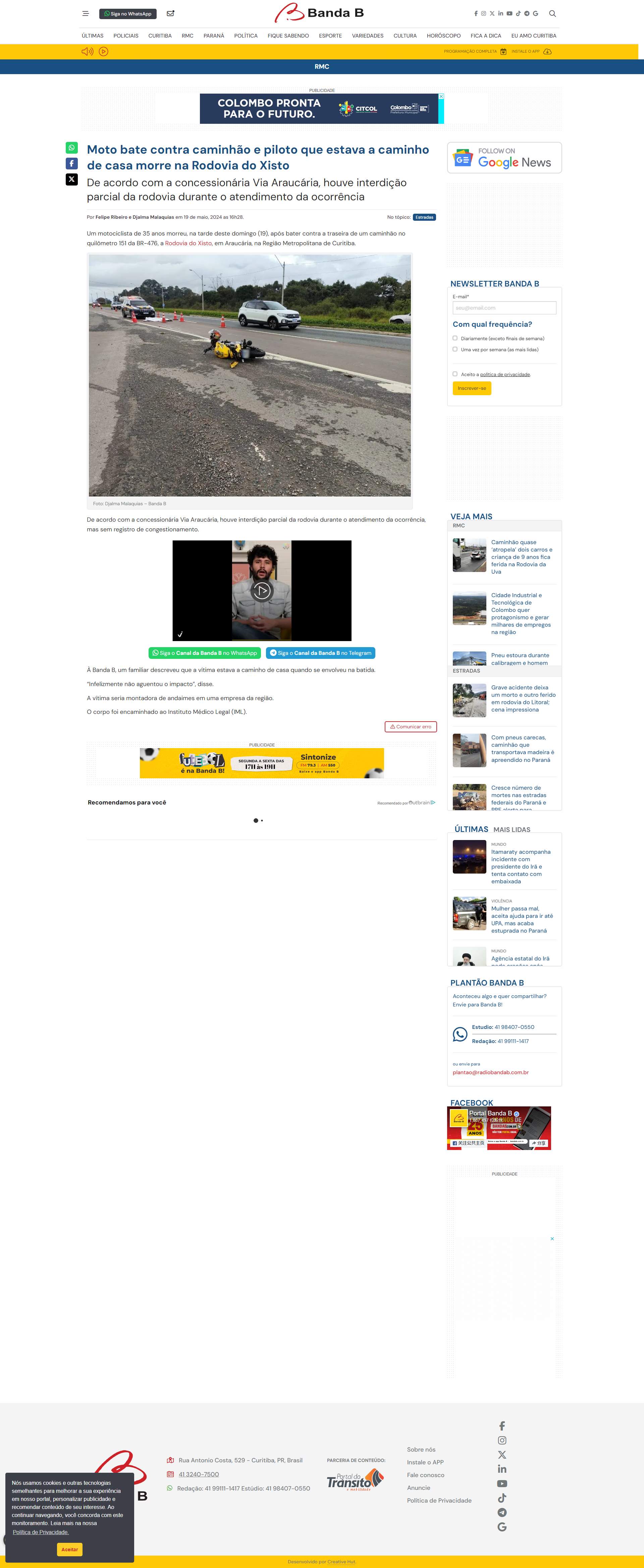Um motociclista de 35 anos morreu, na tarde deste domingo (19), após bater contra a traseira de um caminhão no quilômetro 151 da BR-476, a Rodovia do Xisto, em Araucária, na Região Metropolitana de Curitiba.