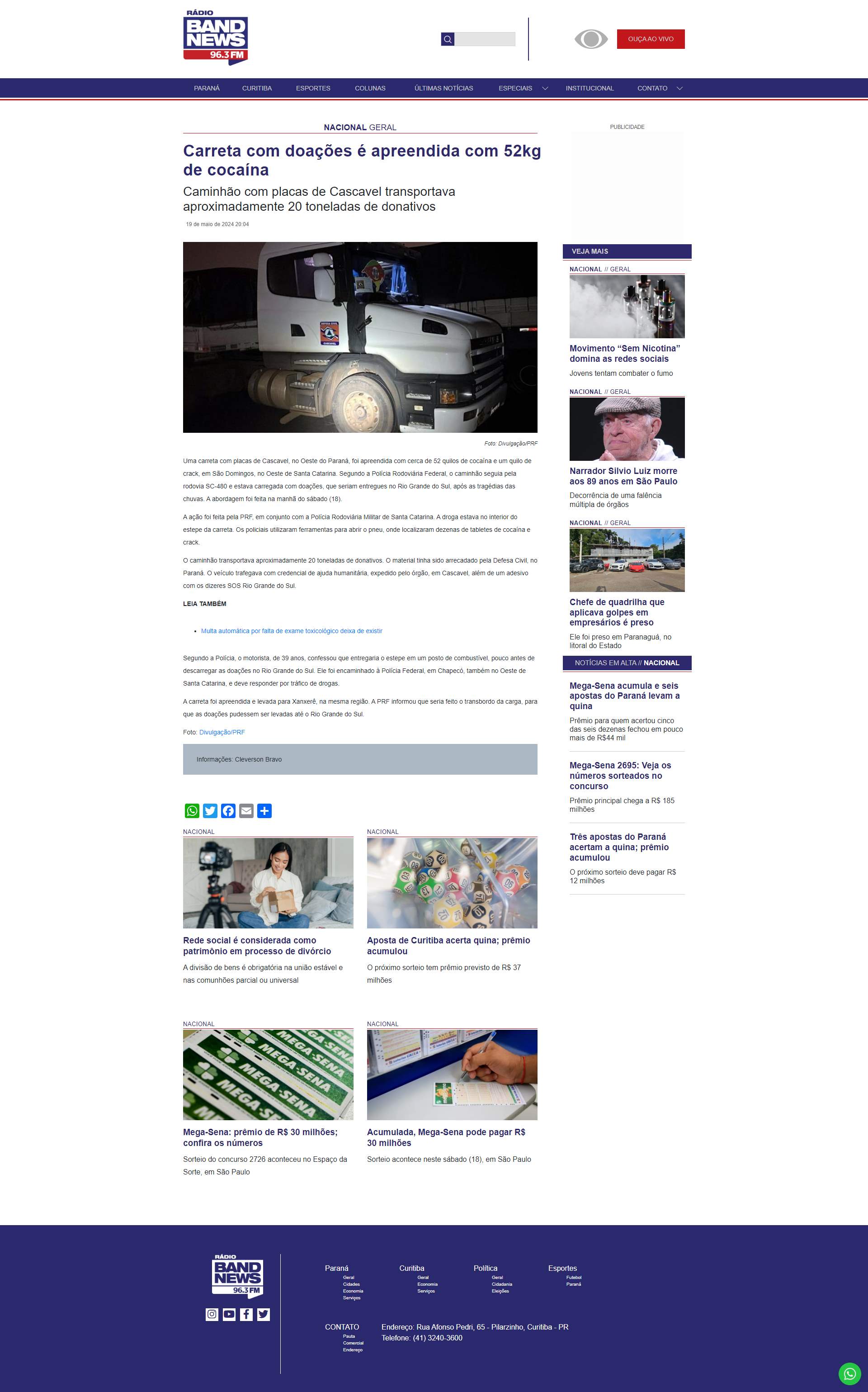Paraná, foi apreendida com cerca de 52 quilos de cocaína e um quilo de crack, em São Domingos, no Oeste de Santa Catarina. Segundo a Polícia Rodoviária Federal, o caminhão seguia pela rodovia SC-480 e estava carregada com doações, que seriam entregues no Rio Grande do Sul, após as tragédias das chuvas. A abordagem foi feita na manhã do sábado (18).