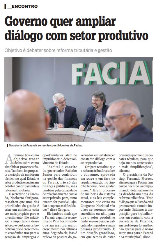 A reunião teve como objetivo trocar ideias sobre como simplificar processos fiscais. Também foi proposta a criação de um fórum técnico no qual Estado e setor produtivo pudessem debater continuamente a reforma tributária. O secretário da Fazenda, Norberto Ortigara, ressaltou que uma das prioridades da gestão é criar um ambiente cada vez mais propício para o investimento. Ele enfatizou a importância desse esforço e destacou os benefícios que o crescimento econômico traz para a geração de empregos e oportunidades, além de impulsionar o desenvolvimento do Estado. “Aceitei o convite do governador Ratinho Junior para contribuir na gestão das finanças do Paraná, não só das finanças públicas, mas também pela capacidade de relacionamento com o setor privado, para, tanto quanto for possível, ajudar a superar as dificuldades”, disse Ortigara. Ele lembrou ainda que o Paraná, a quinta economia do País, foi o Estado que apresentou maior crescimento nos últimos anos. Segundo ele, isso é reflexo da postura do governador em estabelecer constante diálogo com o setor produtivo. Ortigara ressaltou que a reforma tributária sobre o consumo, aprovada em 2023 e em fase de regulamentação no âmbito federal, deve ajudar nisso. “Há um processo de melhoria do sistema atual, e as leis complementares que estão no Congresso Nacional vão dizer se seremos bemsucedidos ou não, para que o setor produtivo tenha menos pessoas calculando impostos e mais pessoas produzindo. É um desafio grandioso, em que temos de estar presentes por meio de debates técnicos, para que haja menos concessões e mais simplificações”, afirmou. O presidente da Faciap, Fernando Moraes, afirmou que a Faciap tem corpo técnico acompanhando detalhadamente os desdobramentos da reforma tributária. “Este diálogo que o Estado está promovendo é muito importante. Estamos à disposição para trabalharmos em conjunto com a Secretaria da Fazenda, em prol do que for melhor não apenas para o nosso setor, mas para o Paraná e os municípios”, disse