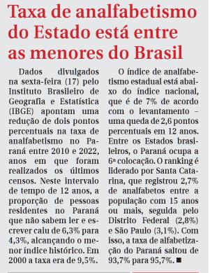 Taxa de analfabetismo do Estado está entre as menores do Brasil
