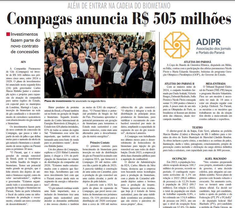 A Companhia Paranaense de Gás (Compagas) vai investir de R$ 505 milhões nos próximos cinco anos, entre 2024 a 2029. O plano de investimentos foi anunciado nesta segunda-feira (24) pelo governador Carlos Massa Ratinho Junior e contempla ações e projetos para expansão da atuação da companhia para outras regiões do Estado, em especial para os municípios de Londrina, Maringá e Lapa, a inserção do biometano na rede de gás canalizado e o desenvolvimento de corredores sustentáveis com abastecimento via gás natural e biometano. Os investimentos fazem parte do novo contrato de concessão da Compagas, que passa a valer a partir do mês de julho e que define metas para o aumento da oferta de gás natural e biometano e o atendimento de novas regiões no Paraná para os próximos 30 anos. “O Paraná, que é o maior gerador de energia renovável do Brasil, pode se transformar na Arábia Saudita do biogás e biometano. Temos um potencial muito grande na geração, que é feita através dos dejetos de animais e biomassa vegetal, como do setor sucroalcooleiro”, explicou o governador. “Estamos organizando todo o ecossistema para a geração de biogás e biometano no Paraná. Tanto na parte tributária e fiscal da cadeia como na infraestrutura de produção e escoamento, criando um novo corredor de desenvolvimento”. Maior produtor de proteína animal do Brasil, o Paraná também sai na frente na geração de biogás e biometano. Segundo levantamento do Centro Internacional de Energias Renováveis (Cibiogás), o Estado tem 426 plantas instaladas, 67% de todas as usinas da região Sul. “Dominamos esse setor tão importante, que também está se tornando uma nova fonte de renda para os produtores rurais”, destacou Ratinho Junior. Um dos planos da Compagas, explicou o CEO Rafael Lamastra Junior, é chegar a 15% da participação do biometano no volume de distribuição da companhia até 2026. “Estamos muito entusiasmados com o anúncio que fizemos hoje. Acreditamos que este novo investimento fará com que o Paraná avance ainda mais no segmento de energia e infraestrutura”, afirmou. “O gás natural continua sendo uma fonte importante, mas a inclusão do biometano traz uma pegada mais sustentável para atender as demandas ambientais e dos nossos clientes e também as metas de ESG da empresa", disse. “O Paraná lidera o potencial produtivo de biogás no Sul do País. Precisamos aproveitar o potencial paranaense em geração de biometano para tornarmos o Estado mais sustentável e com menos emissões, como mais uma alternativa para a descarbonização da matriz energética”. Primeiro Contato O primeiro contrato para fornecimento de biometano para inserção na rede de distribuição de gás no Paraná foi assinado com a empresa H2A, que fornecerá à Compagas 20 mil metros cúbicos/dia a partir de julho de 2025. A parceria viabiliza a construção de uma usina em Carambeí, para a produção do gás renovável em uma cadeia circular, a partir de dejetos do polo leiteiro. A parceria com a H2A faz parte do plano de expansão da Compagas, que prevê novos contratos de biometano nos próximos meses. Os 15% previstos para a distribuição até 2026 correspondem a cerca de 100 mil metros cúbicos/dia de gás renovável. “O objetivo é integrar a rede de distribuição às principais áreas produtoras de biometano, para viabilizar o escoamento do combustível renovável por meio de dutos, ampliando a capacidade de expansão do uso do gás renovável”, destacou Lamastra. A Compagas vem trabalhando nos últimos meses para o desenvolvimento de fornecedores de biometano para injeção do gás renovável em suas redes de distribuição. Desde 2023, a empresa já abriu duas chamadas públicas para a aquisição do combustível. O diretor de Administração da H2A, Carlos Alberto da Silva Souza, destacou que a empresa vem buscando novas tecnologias para a produção de biometano, com a planta de Carambeí utilizando dejetos suínos e bovinos para a produção do insumo. “Vamos aproveitar esse resíduo, que hoje já é tratado de forma sustentável, para dar uma viabilidade econômica aos produtores, que são sócios e parceiros do nosso projeto”, disse.