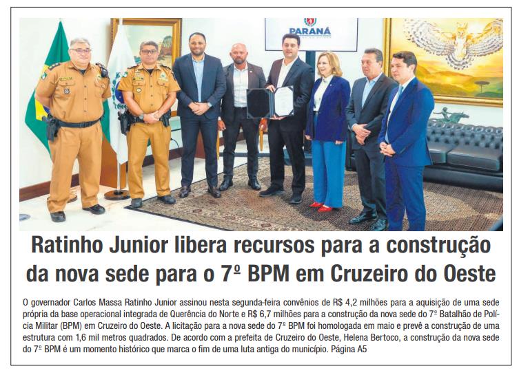 O governador Carlos Massa Ratinho Junior assinou nesta segunda-feira convênios de R$ 4,2 milhões para a aquisição de uma sede própria da base operacional integrada de Querência do Norte e R$ 6,7 milhões para a construção da nova sede do 7º Batalhão de Polícia Militar (BPM) em Cruzeiro do Oeste. A licitação para a nova sede do 7º BPM foi homologada em maio e prevê a construção de uma estrutura com 1,6 mil metros quadrados. De acordo com a prefeita de Cruzeiro do Oeste, Helena Bertoco, a construção da nova sede do 7º BPM é um momento histórico que marca o fim de uma luta antiga do município. Página A5