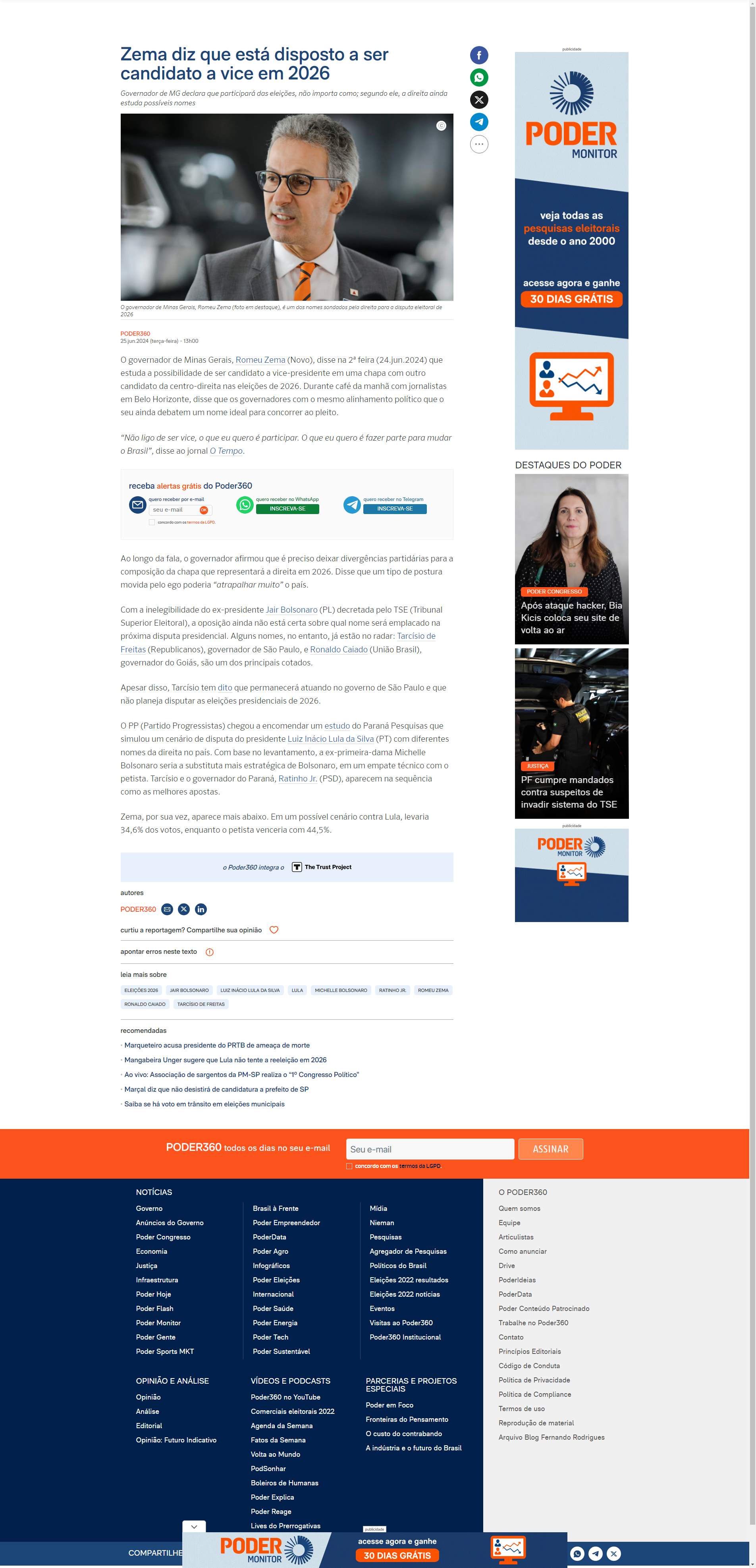 governador de Minas Gerais, Romeu Zema (Novo), disse na 2ª feira (24.jun.2024) que estuda a possibilidade de ser candidato a vice-presidente em uma chapa com outro candidato da centro-direita nas eleições de 2026. Durante café da manhã com jornalistas em Belo Horizonte, disse que os
