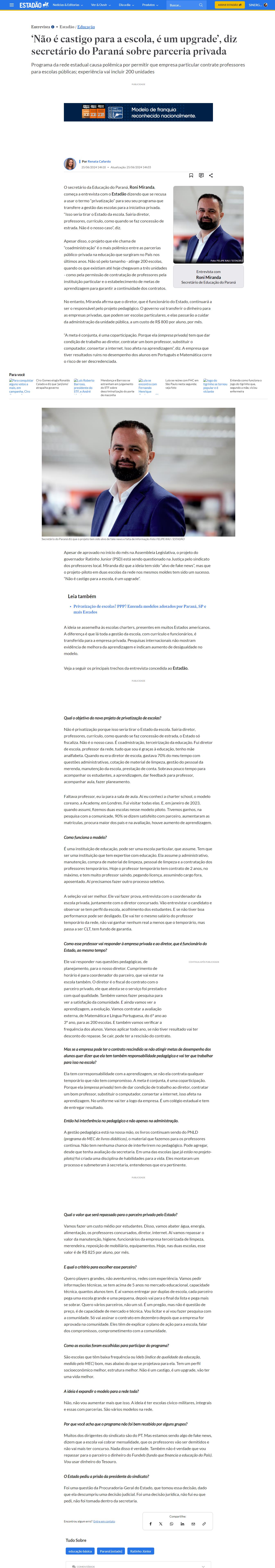 O secretário da Educação do Paraná, Roni Miranda, começa a entrevista com o Estadão dizendo que se recusa a usar o termo “privatização” para seu seu programa que transfere a gestão das escolas para a iniciativa privada. “Isso seria tirar o