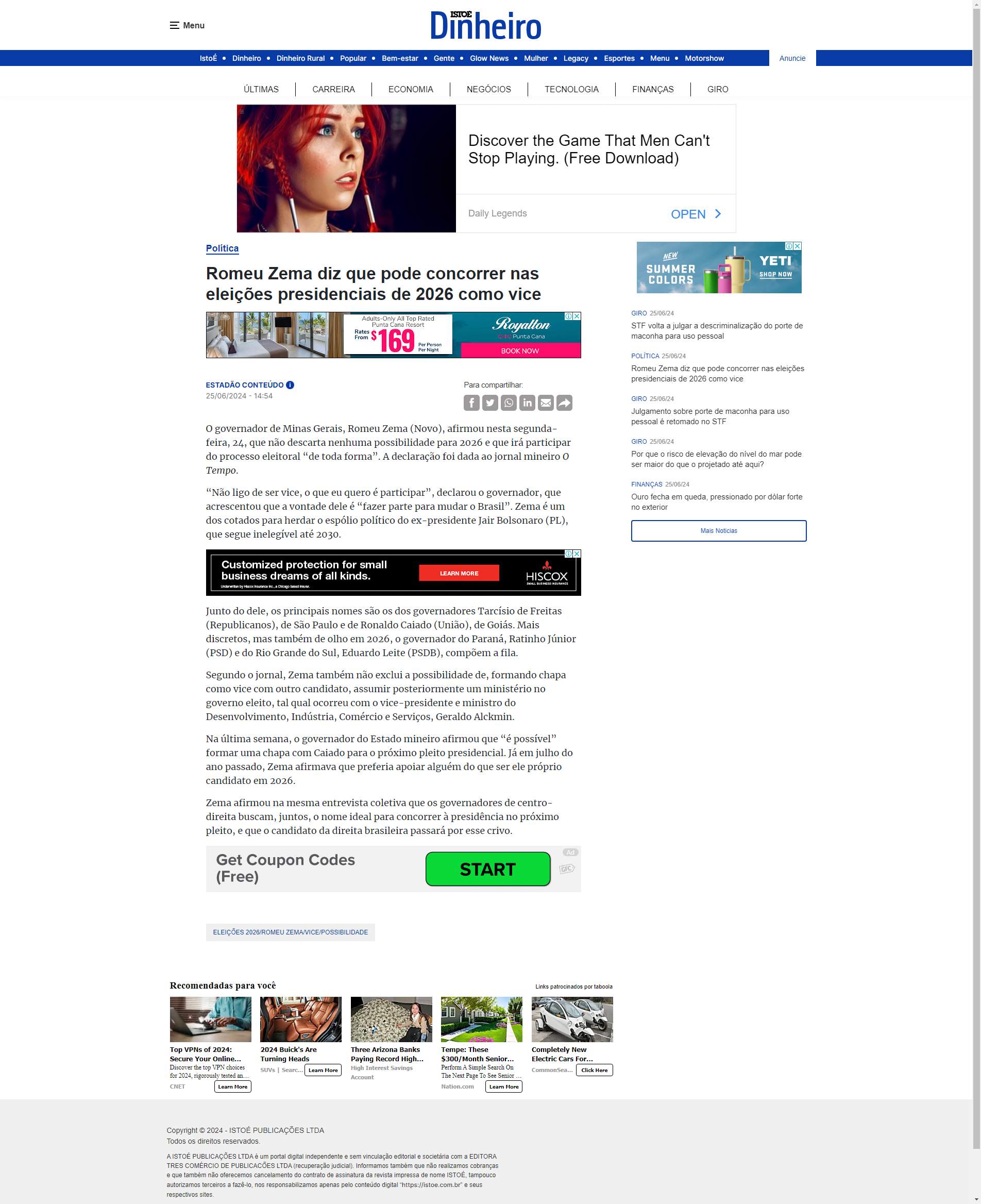 governador de Minas Gerais, Romeu Zema (Novo), afirmou nesta segunda-feira, 24, que não descarta nenhuma possibilidade para 2026 e que irá participar do processo eleitoral “de toda forma”. A declaração foi dada ao jornal mineiro O Tempo.