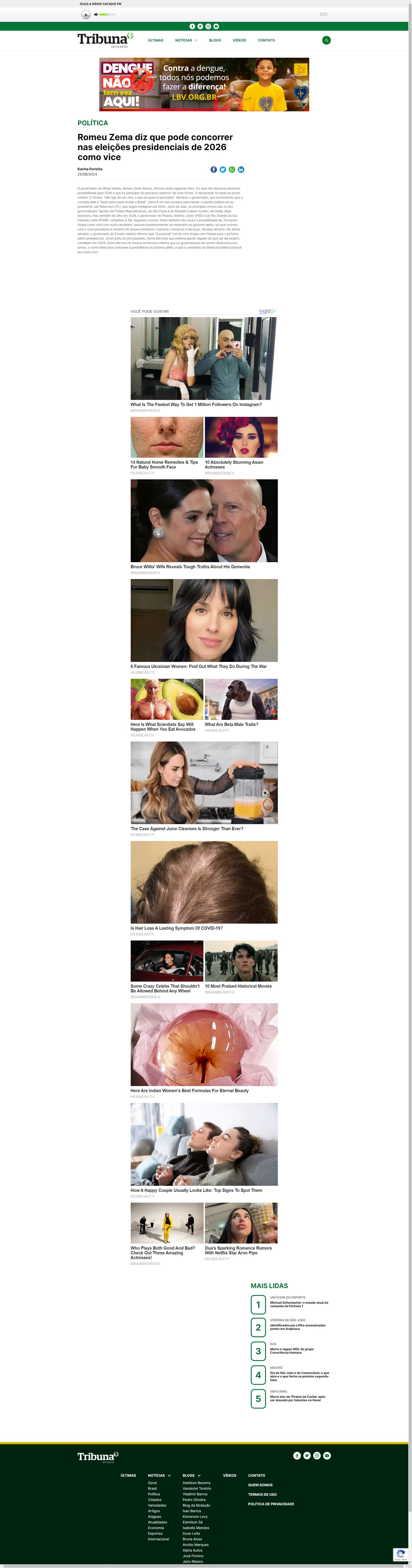 Estado mineiro afirmou que "é possível" formar uma chapa com Caiado para o próximo pleito presidencial. Já em julho do ano passado, Zema afirmava que preferia apoiar alguém do que ser ele próprio candidato em 2026. Zema afirmou na mesma entrevista coletiva que os