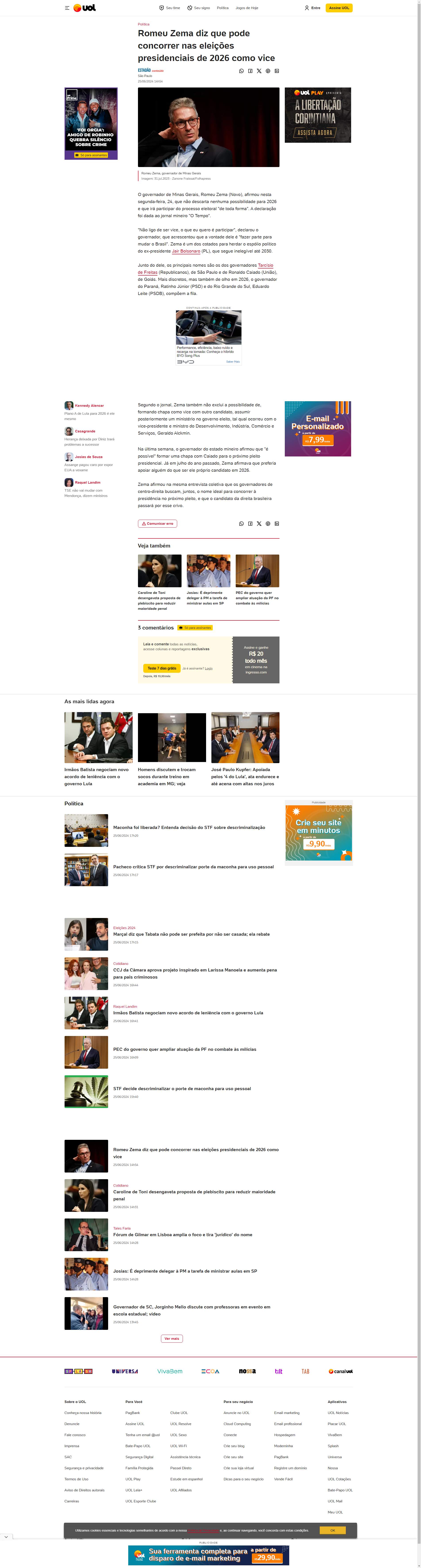 governador de Minas Gerais, Romeu Zema (Novo), afirmou nesta segunda-feira, 24, que não descarta nenhuma possibilidade para 2026 e que irá participar do processo eleitoral "de toda forma". A declaração foi dada ao jornal mineiro O Tempo.