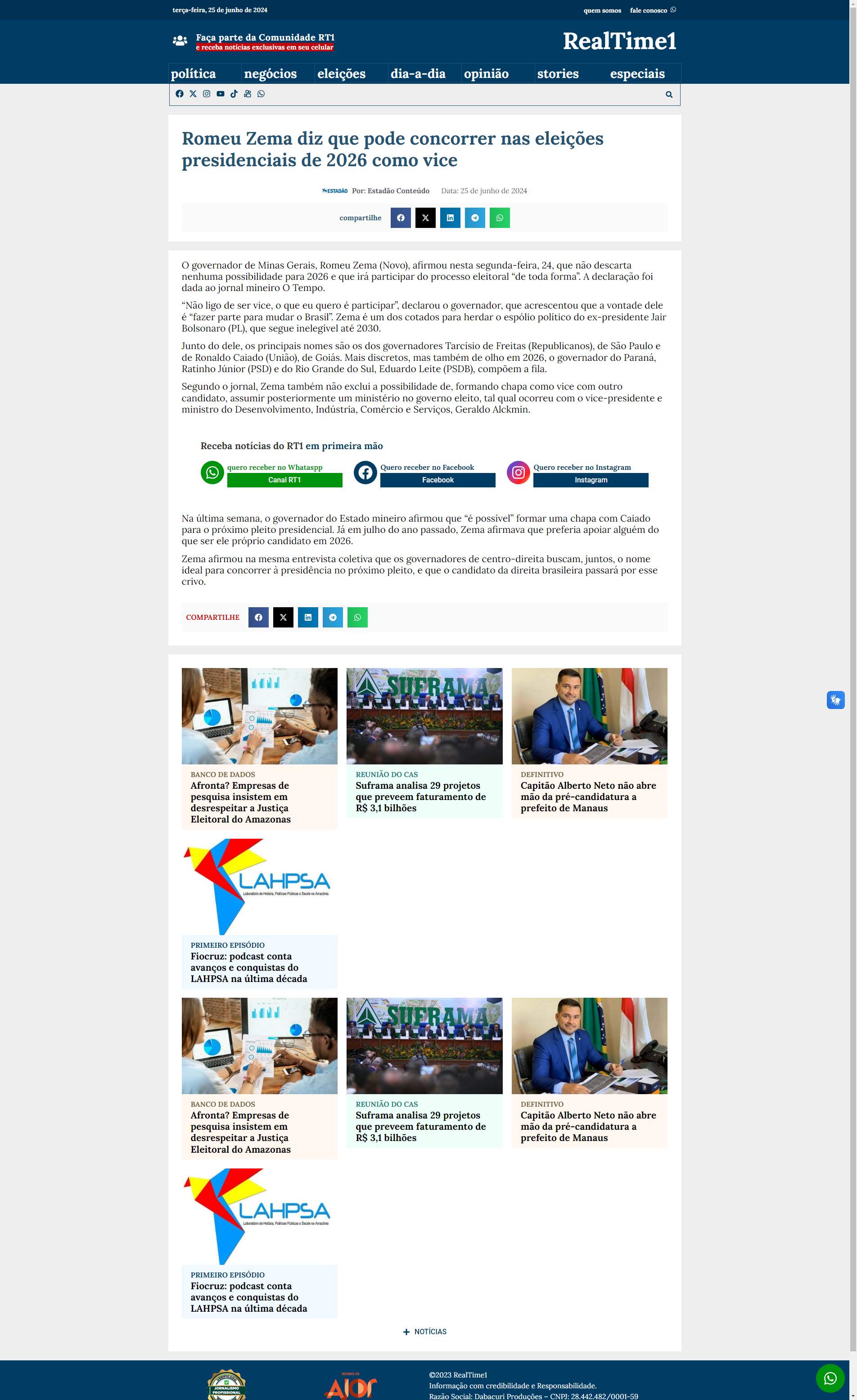 governador de Minas Gerais, Romeu Zema (Novo), afirmou nesta segunda-feira, 24, que não descarta nenhuma possibilidade para 2026 e que irá participar do processo eleitoral “de toda forma”. A declaração foi dada ao jornal mineiro O Tempo.