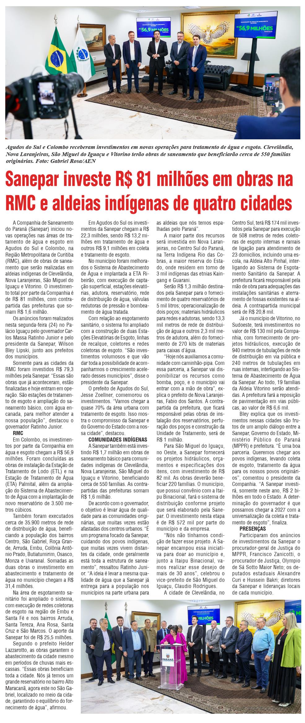 A Companhia de Saneamento do Paraná (Sanepar) iniciou novas operações nas áreas de tratamento de água e esgoto em Agudos do Sul e Colombo, na Região Metropolitana de Curitiba (RMC), além de obras de saneamento que serão realizadas em aldeias indígenas de Clevelândia, Nova Laranjeiras, São Miguel do Iguaçu e Vitorino. O investimento total por parte da Companhia é de R$ 81 milhões, com contrapartida das prefeituras que somam R$ 1,6 milhão. Os anúncios foram realizados nesta segunda-feira (24) no Palácio Iguaçu pelo governador Carlos Massa Ratinho Junior e pelo presidente da Sanepar, Wilson Bley Lipski, junto aos prefeitos dos municípios. Somente para as cidades da RMC foram investidos R$ 79,3 milhões pela Sanepar. “Essas são obras que já aconteceram, estão finalizadas e hoje entram em operação. São estações de tratamento de esgoto e ampliação do saneamento básico, com água encanada, para melhor atender a nossa população”, destacou o governador Ratinho Junior. RMC Em Colombo, os investimentos por parte da Companhia em água e esgoto chegam a R$ 56,9 milhões. Foram concluídas as obras de instalação da Estação de Tratamento de Lodo (ETL) e na Estação de Tratamento de Água (ETA) Palmital, além da amplia- ção do Sistema de Abastecimento de Água com a implantação de novo reservatório de 3.500 metros cúbicos. Também foram executados cerca de 35.900 metros de rede de distribuição de água, beneficiando a população dos bairros Centro, São Gabriel, Roça Grande, Arruda, Embu, Colônia Antô- nio Prado, Butiatumirim, Osasco, Monza e Uvaranal. Somadas as duas obras o investimento em abastecimento e tratamento de água no município chegam a R$ 31,4 milhões. Na área de esgotamento sanitário foi ampliado o sistema, com execução de redes coletoras de esgoto na região de Embu e Santa Fé e nos bairros Arruda, Santa Tereza, Ana Rosa, Santa Cruz e São Marcos. O aporte da Sanepar foi de R$ 25,5 milhões. Segundo o prefeito Helder Lazzarotto, as obras garantem o abastecimento da cidade mesmo em períodos de chuvas mais escassas. “Essas obras beneficiam toda a cidade. Nós já temos um grande reservatório no bairro Alto Maracanã, agora este no São Gabriel, localizado no meio da cidade, garantindo o equilíbrio do fornecimento de água”, afirmou. Em Agudos do Sul os investimentos da Sanepar chegam a R$ 22,3 milhões, sendo R$ 13,2 milhões em tratamento de água e outros R$ 9,1 milhões em coleta e tratamento de esgoto. No município foram melhorados o Sistema de Abastecimento de Água e implantada a ETA Ribeirão, com execução de capta- ção superficial, estações elevató- rias, adutora, reservatório, rede de distribuição de água, válvulas redutoras de pressão e bombeamento de água tratada. Com relação ao esgotamento sanitário, o sistema foi ampliado com a construção de duas Esta- ções Elevatórias de Esgoto, linhas de recalque, coletores e redes coletoras de esgoto. “São investimentos volumosos e que vão dar toda a possibilidade de acompanharmos o crescimento acelerado desses municípios”, disse o presidente da Sanepar. O prefeito de Agudos do Sul, Jesse Zoellner, comemorou os investimentos. “Vamos chegar a quase 70% da área urbana com tratamento de esgoto. Isso mostra o compromisso da Sanepar e do Governo do Estado com a nossa cidade”, destacou. COMUNIDADES INDÍGENAS A Sanepar também está investindo R$ 1,7 milhão em obras de saneamento básico para comunidades indígenas de Clevelândia, Nova Laranjeiras, São Miguel do Iguaçu e Vitorino, beneficiando cerca de 550 famílias. As contrapartidas das prefeituras somam R$ 1,6 milhão. De acordo com o governador, o objetivo é levar água de qualidade para as comunidades originárias, que muitas vezes estão afastadas dos centros urbanos. “É um programa focado da Sanepar, cuidando dos povos indígenas, que muitas vezes vivem distantes da cidade, onde geralmente está toda a estrutura de saneamento”, ressaltou Ratinho Junior. “A ideia é levar a mesma qualidade de água que a Sanepar já entrega para a população nos municípios na parte urbana para as aldeias que nós temos espalhadas pelo Paraná”. A maior parte dos recursos será investida em Nova Laranjeiras, no Centro Sul do Paraná, na Terra Indígena Rio das Cobras, a maior reserva do Estado, onde residem em torno de 3 mil indígenas das etnias Kaingang e Guarani. Serão R$ 1,3 milhão destinados pela Sanepar para o fornecimento de quatro reservatórios de 5 mil litros; operacionalização de dois poços; materiais hidráulicos para redes e adutoras, sendo 13,3 mil metros de rede de distribui- ção de água e outros 2,3 mil metros de adutora, além do fornecimento de 270 kits de materiais para caixas d’água. “Hoje nós auxiliamos a comunidade com caminhão-pipa. Com essa parceria, a Sanepar vai disponibilizar os recursos como bomba, poço, e o município vai entrar com a mão de obra”, explica o prefeito de Nova Laranjeiras, Fabio dos Santos. A contrapartida da prefeitura, que ficará responsável pelas obras de instalação dos reservatórios, perfuração dos poços e construção da Unidade de Tratamento, será de R$ 1 milhão. Para São Miguel do Iguaçu, no Oeste, a Sanepar fornecerá os projetos hidráulicos, orçamentos e especificações dos itens, com investimento de R$ 82 mil. As obras deverão beneficiar 220 famílias. O município, que possui convênio com a Itaipu Binacional, fará o sistema de distribuição conforme projeto que será elaborado pela Sanepar. O investimento nesta etapa é de R$ 572 mil por parte do município e da empresa. “Nós não tínhamos condi- ção de fazer esse projeto. A Sanepar encampou essa iniciativa para doar ao município e, junto a Itaipu Binacional, vamos realizar esse desejo de mais de 30 anos”, celebrou o vice-prefeito de São Miguel do Iguaçu, Claudio Rodrigues. A cidade de Clevelândia, no Centro Sul, terá R$ 174 mil investido