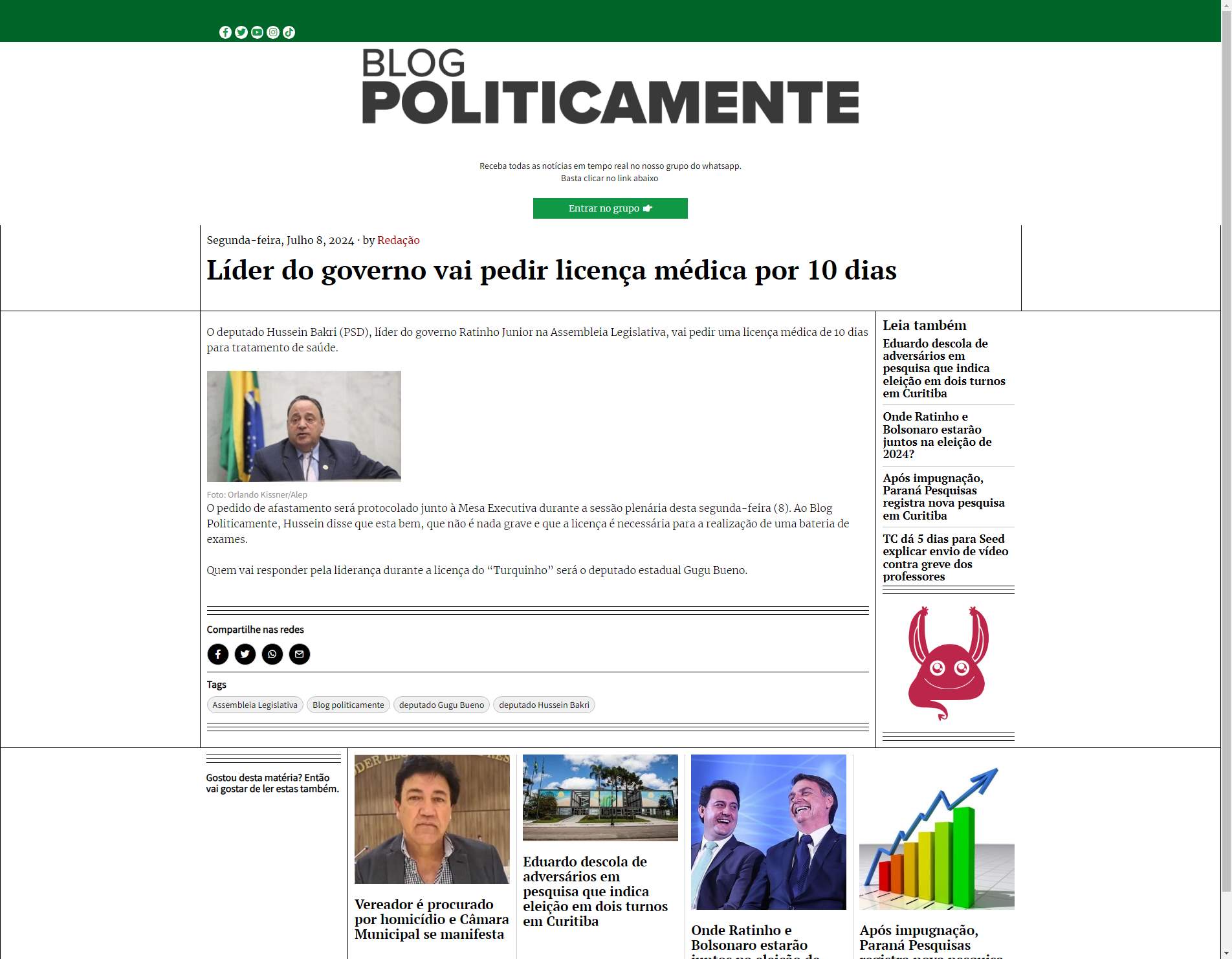 Assembleia Legislativa, vai pedir uma licença médica de 10 dias para tratamento de saúde.