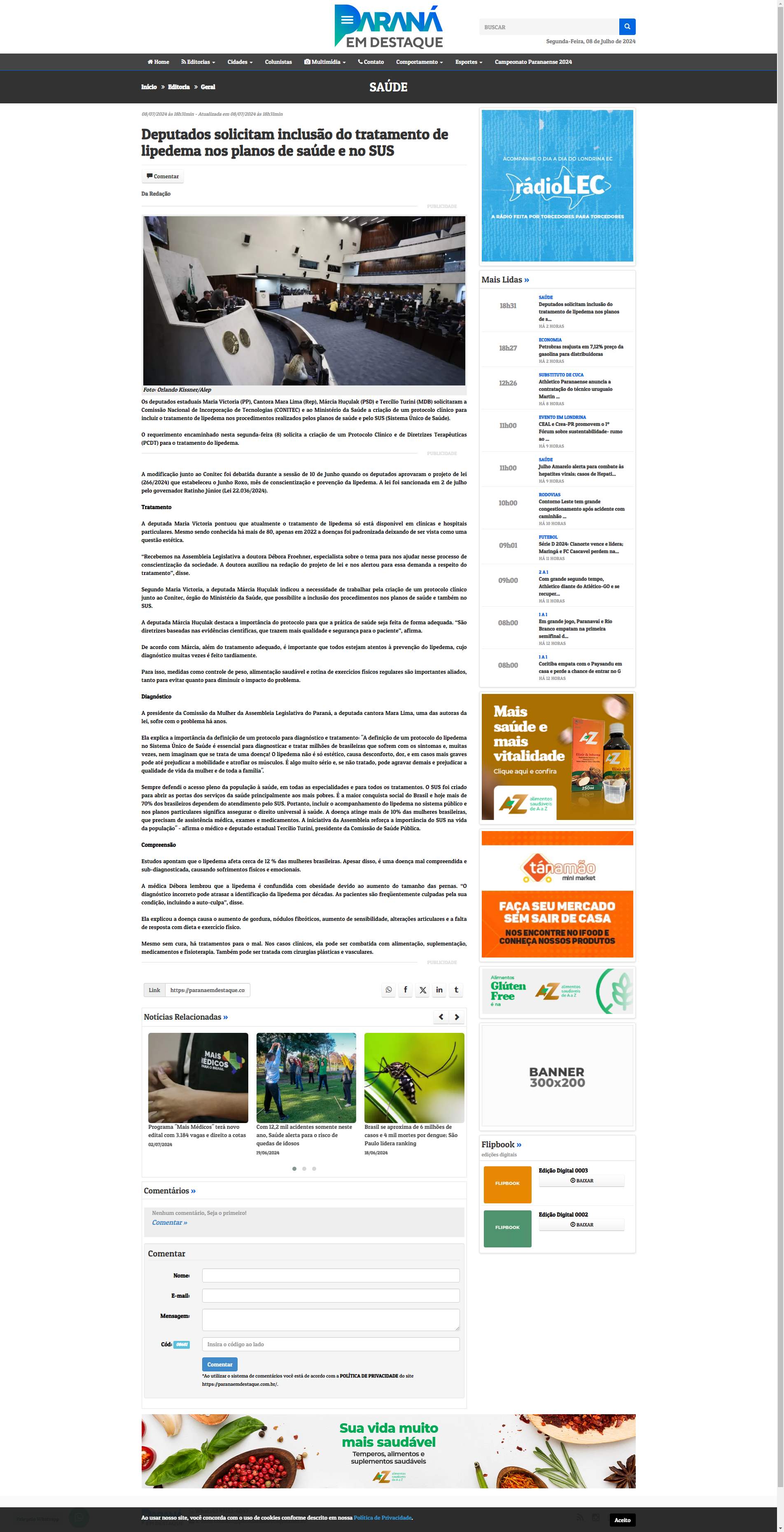 deputados estaduais Maria Victoria (PP), Cantora Mara Lima (Rep), Márcia Huçulak (PSD) e Tercilio Turini (MDB) solicitaram a Comissão Nacional de Incorporação de Tecnologias (CONITEC) e ao Ministério da Saúde a criação de um protocolo clínico para incluir o tratamento de lipedema nos procedimentos realizados pelos planos de saúde e pelo SUS (Sistema Único de Saúde).