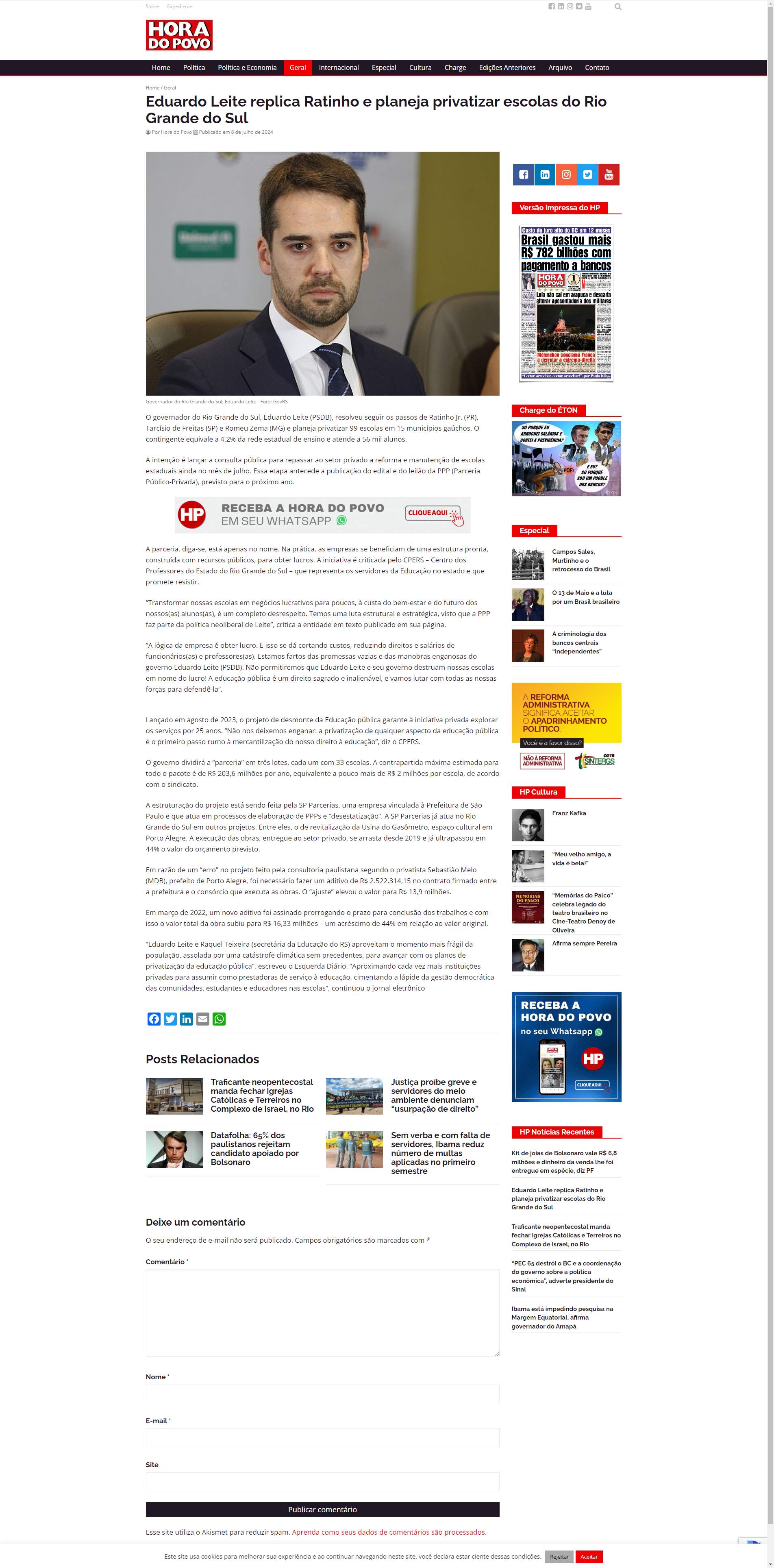 “Eduardo Leite e Raquel Teixeira (secretária da Educação do RS) aproveitam o momento mais frágil da população, assolada por uma catástrofe climática sem precedentes, para avançar com os planos de privatização da educação pública”, escreveu o Esquerda Diário. “Aproximando cada vez mais instituições privadas para assumir como prestadoras de serviço à educação, cimentando a lápide da gestão democrática das comunidades, estudantes e educadores nas escolas”, continuou o jornal eletrônico
