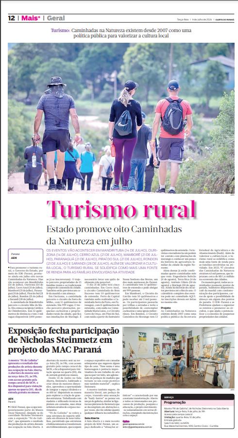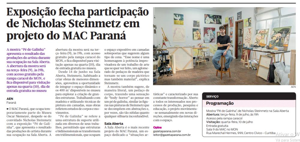 O MAC Paraná, que ocupa temporariamente parte do Museu Oscar Niemeyer, despede-se do convidado Nicholas Steinmetz com a exposição “Pé de Galinha”, que apresenta o resultado das produções do artista durante sua ocupação na Sala Aberta. A abertura da mostra será na terça-feira (9), às 19h, com acesso gratuito pela rampa caracol do MON, e fi ca disponível para visitação apenas na quarta (10), dia de entrada gratuita no museu. Desde 14 de junho na Sala Aberta, Steinmetz, habituado a criar obras de menores dimensões, aproveitou a oportunidade de integrar o espaço dinâmico e os 400 m² disponíveis no museu para explorar a criação de grandes estruturas. Trabalhando com madeira e utilizando técnicas de pintura em camadas, suas obras refl etem estudos de corpos e movimentos. “Pé de Galinha” se refere a uma estrutura de suporte utilizada em diversos de seus trabalhos, permitindo que estruturas e bidimensionais se transformem em tridimensionais, que ocupam o espaço expositivo em camadas sobrepostas que sugerem algum tipo de cena. “Esse nome é uma homenagem à potência improvisadora de um trabalho de arte que se quer ver feito, um aglomerado de pedaços de madeira que tornam-se um corpo pictórico mas também material”, explica Steinmetz. A mostra também sugere, de maneira literal, um pedaço de corpo, trazendo uma sensação de “body-horror” ao pensar em um pé de galinha, similar às fi guras nas pinturas de Steinmetz que se decompõem em abstrações e, por vezes, são tão nítidas quanto qualquer silhueta inconfundível. Sala Aberta A Sala Aberta é o mais recente projeto do MAC Paraná, um espaço dedicado a “situações artísticas” e caracterizado por sua constante transformação. Aberto a todos os interessados nos processos de produção, pesquisa e educação, o projeto movimenta- -se semanalmente em novas direções, emergindo das interações com o espaço.