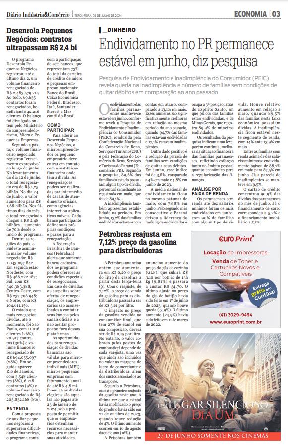 O endividamento das famílias paranaenses manteve-se estável em junho, conforme revela a Pesquisa de Endividamento e Inadimplência do Consumidor (PEIC), conduzida pela Confederação Nacional do Comércio de Bens, Serviços e Turismo (CNC) e pela Federação do Comércio de Bens, Serviços e Turismo do Paraná (Fecomércio PR). Segundo a pesquisa, 89,6% das famílias do estado possuíam algum tipo de dívida, percentual semelhante ao registrado em maio, que foi de 89,4%. A inadimplência também apresentou estabilidade no período. Em junho, 13,2% das famílias endividadas estavam com contas em atraso, comparado a 13,1% em maio. Esses números são significativamente melhores em relação ao mesmo período do ano passado, quando 94,7% das famílias estavam endividadas e 17,1% estavam inadimplentes. Outro dado positivo é a redução da parcela de famílias sem condições de quitar seus débitos. Em junho, esse índice foi de 3,8%, comparado a 4% em maio e 4,8% em junho de 2023. A média nacional de endividamento ficou no mesmo patamar de maio, com 78,8% em junho. Pelo segundo mês consecutivo o Paraná deixou a liderança do ranking de endividados e ocupa a 3ª posição, atrás do Espírito Santo, em que 90,6% das famílias estão endividadas, e de Minas Gerais, que registra 89,9% de mineiros endividados. Os resultados da pesquisa indicam uma leve, porém contínua, melhora na situação financeira das famílias paranaenses, refletindo esforços tanto no âmbito pessoal quanto econômico para a regularização das finanças. Análise por faixa de renda Os paranaenses com renda até dez salários mínimos foram os mais endividados em junho, com 90% de famílias com algum tipo de dívida. Houve relativo aumento em relação a maio, quando 89,5% das famílias nesta faixa econômica possuíam dívidas. A inadimplência ficou estável neste segmento de renda, com 14% ante 13,9% em maio. Entre as famílias com renda acima de dez salários mínimos o endividamento baixou de 88,7% em maio para 87,5% em junho. Já a parcela de inadimplentes se manteve em 9,5%. O cartão de crédito concentrou 90,9% das dívidas dos paranaenses no mês de junho. Já o financiamento de carro correspondeu a 5,2% e o financiamento imobiliário a 5,1%.