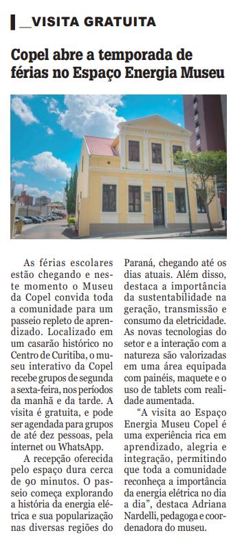 As férias escolares estão chegando e neste momento o Museu da Copel convida toda a comunidade para um passeio repleto de aprendizado. Localizado em um casarão histórico no Centro de Curitiba, o museu interativo da Copel recebe grupos de segunda a sexta-feira, nos períodos da manhã e da tarde. A visita é gratuita, e pode ser agendada para grupos de até dez pessoas, pela internet ou WhatsApp. A recepção oferecida pelo espaço dura cerca de 90 minutos. O passeio começa explorando a história da energia elétrica e sua popularização nas diversas regiões do Paraná, chegando até os dias atuais. Além disso, destaca a importância da sustentabilidade na geração, transmissão e consumo da eletricidade. As novas tecnologias do setor e a interação com a natureza são valorizadas em uma área equipada com painéis, maquete e o uso de tablets com realidade aumentada. “A visita ao Espaço Energia Museu Copel é uma experiência rica em aprendizado, alegria e integração, permitindo que toda a comunidade reconheça a importância da energia elétrica no dia a dia”, destaca Adriana Nardelli, pedagoga e coordenadora do museu.