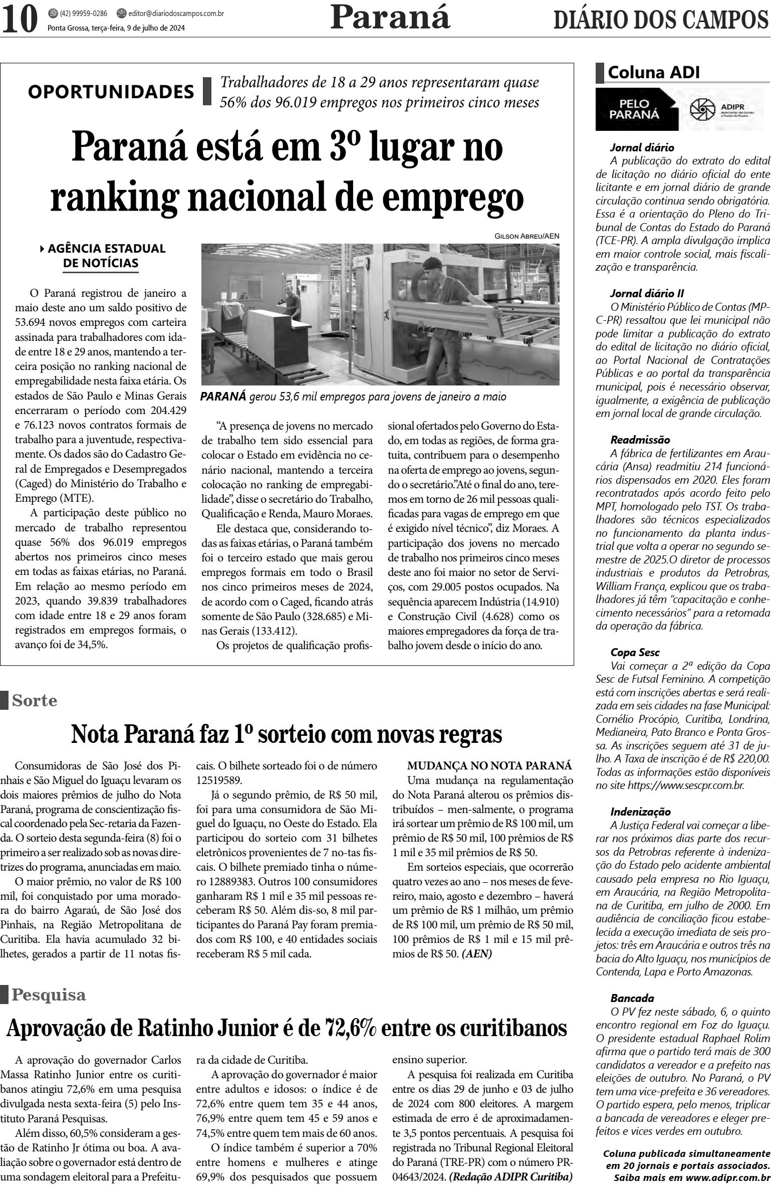 A aprovação do governador Carlos Massa Ratinho Junior entre os curitibanos atingiu 72,6% em uma pesquisa divulgada nesta sexta-feira (5) pelo Instituto Paraná Pesquisas. Além disso, 60,5% consideram a gestão de Ratinho Jr ótima ou boa. A avaliação sobre o governador está dentro de uma sondagem eleitoral para a Prefeitura da cidade de Curitiba. A aprovação do governador é maior entre adultos e idosos: o índice é de 72,6% entre quem tem 35 e 44 anos, 76,9% entre quem tem 45 e 59 anos e 74,5% entre quem tem mais de 60 anos. O índice também é superior a 70% entre homens e mulheres e atinge 69,9% dos pesquisados que possuem ensino superior. A pesquisa foi realizada em Curitiba entre os dias 29 de junho e 03 de julho de 2024 com 800 eleitores. A margem estimada de erro é de aproximadamente 3,5 pontos percentuais. A pesquisa foi registrada no Tribunal Regional Eleitoral do Paraná (TRE-PR) com o número PR- 04643/2024. (Redação ADIPR Curitiba)