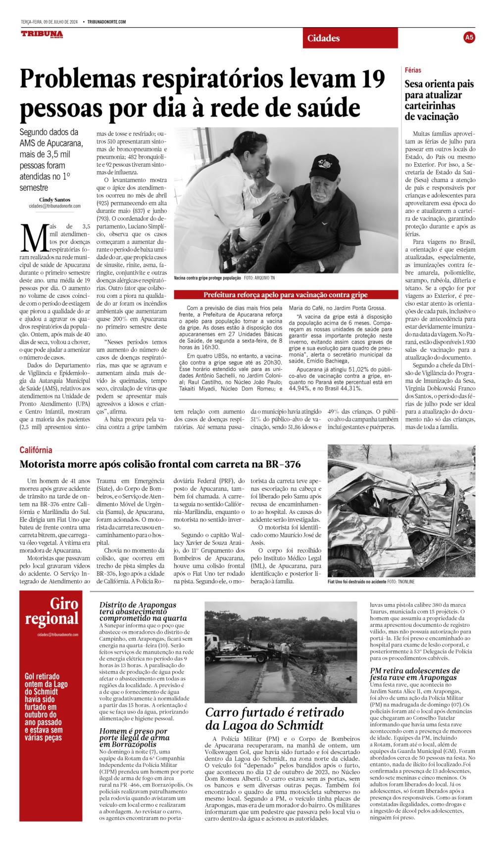 Muitas famílias aproveitam as férias de julho para passear em outros locais do Estado, do País ou mesmo no Exterior. Por isso, a Secretaria de Estado da Saúde (Sesa) chama a atenção de pais e responsáveis por crianças e adolescentes para aproveitarem essa época do ano e atualizarem a carteira de vacinação, garantindo proteção durante e após as férias. Para viagens no Brasil, a orientação é que estejam atualizadas, especialmente, as imunizações contra febre amarela, poliomielite, sarampo, rubéola, difteria e tétano. Se a opção for por viagens ao Exterior, é preciso estar atento às orienta- ções de cada país, inclusive o prazo de antecedência para estar devidamente imunizado na data da viagem. No Paraná, estão disponíveis 1.930 salas de vacinação para a atualização do documento. Segundo a chefe da Divisão de Vigilância do Programa de Imunização da Sesa, Virginia Dobkowski Franco dos Santos, o período das fé rias de julho pode ser ideal para a atualização do documento não só das crianças, mas de toda a família.